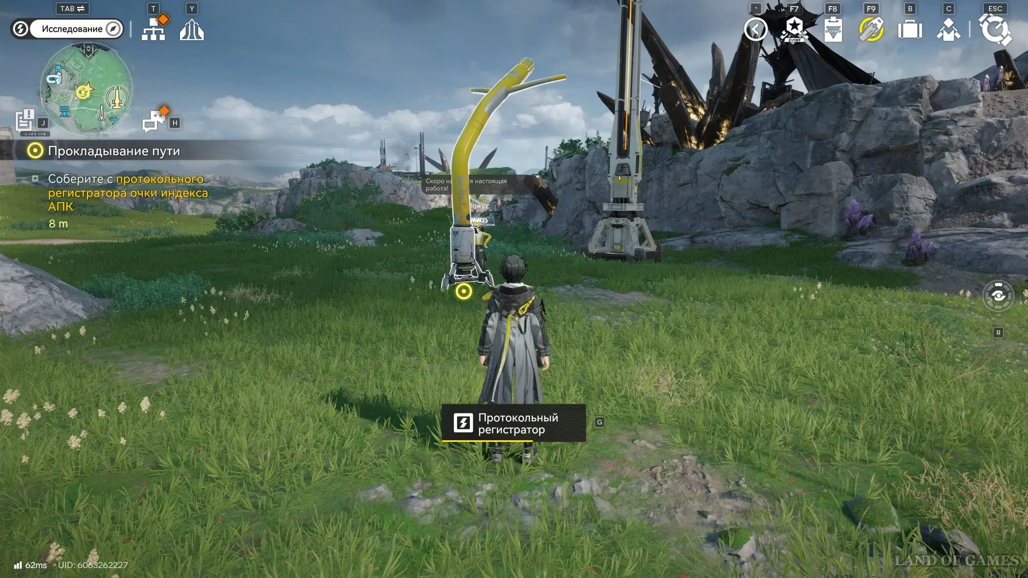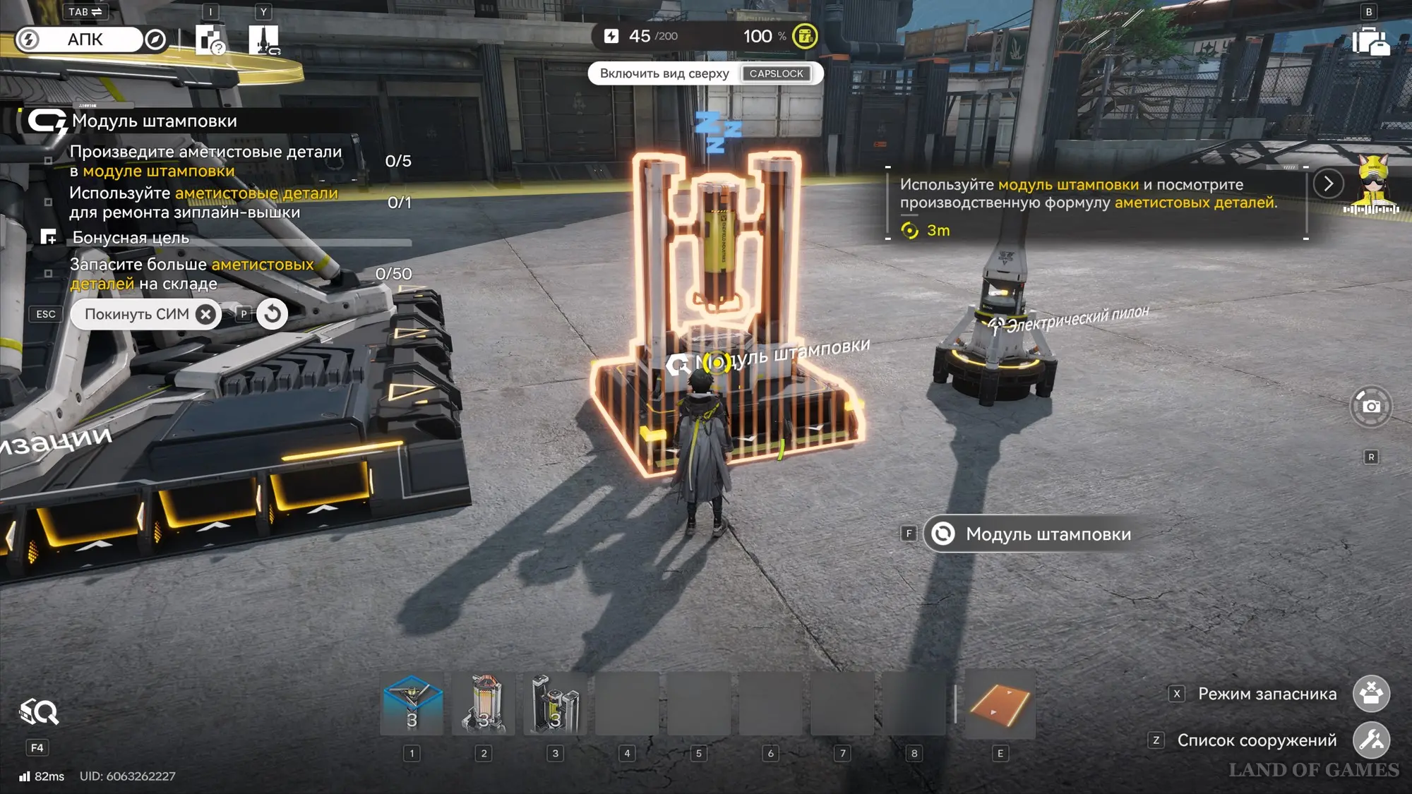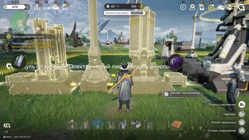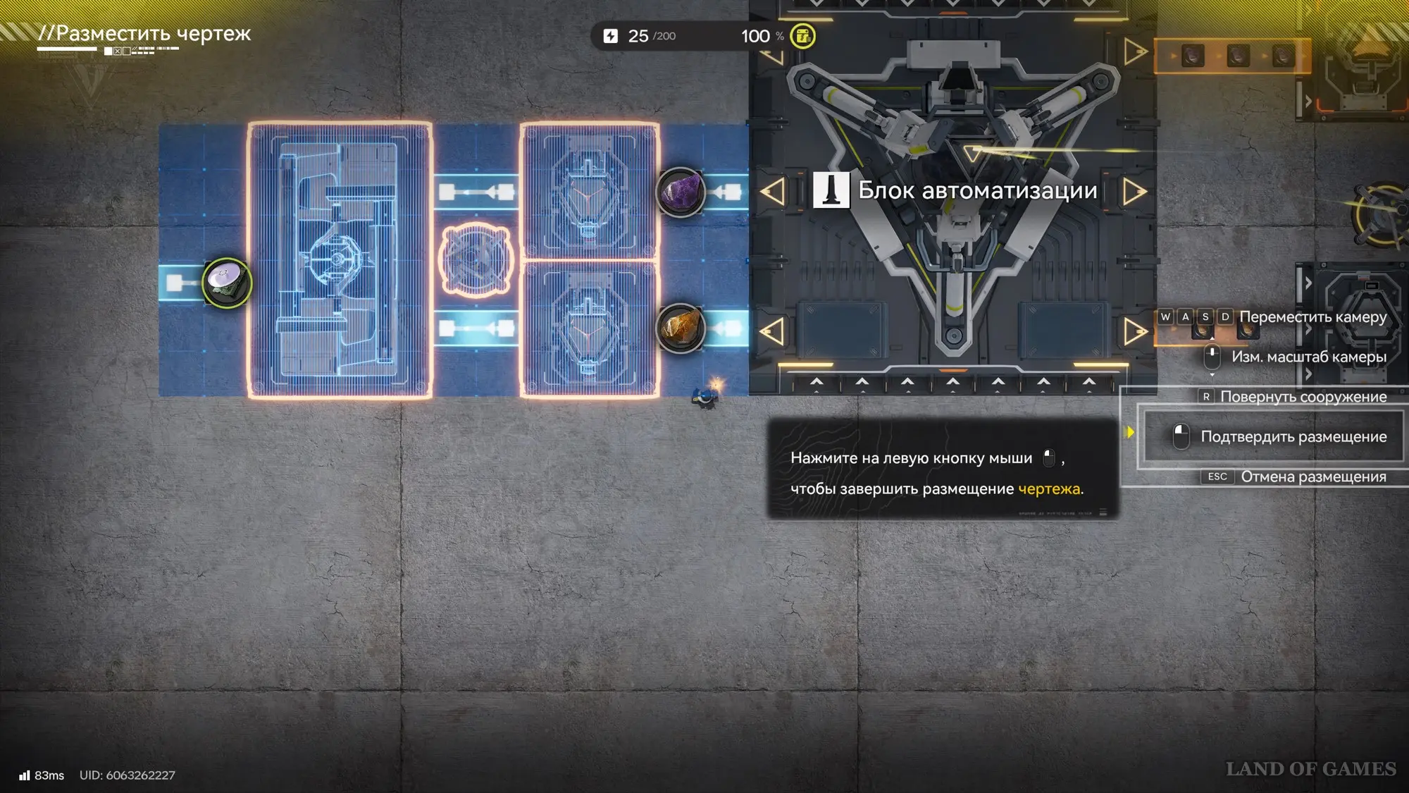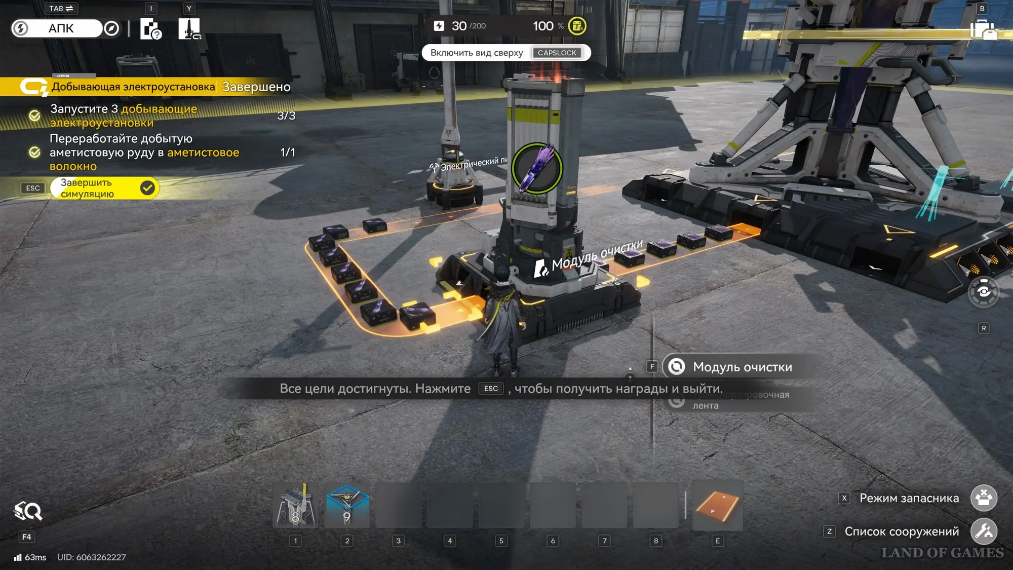 Стартует обучение – внимательно изучите инструкцию. Для начала исследуйте принцип работы добывающей электроустановки (если коротко – она собирает руду и тут же переносит ее на склад). Далее установите еще два устройства в отмеченных зонах и разместите по центру электрический пилон, к которому необходимо подвести электроэнергию от вышки электропередачи. Весь процесс показан на гифке ниже.