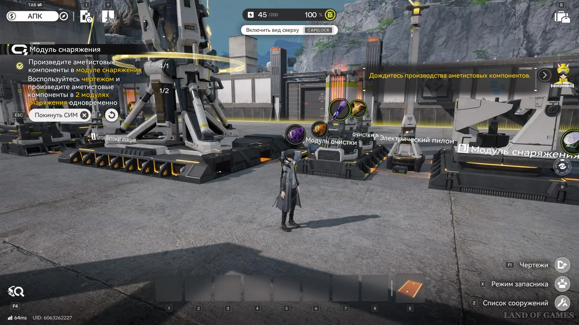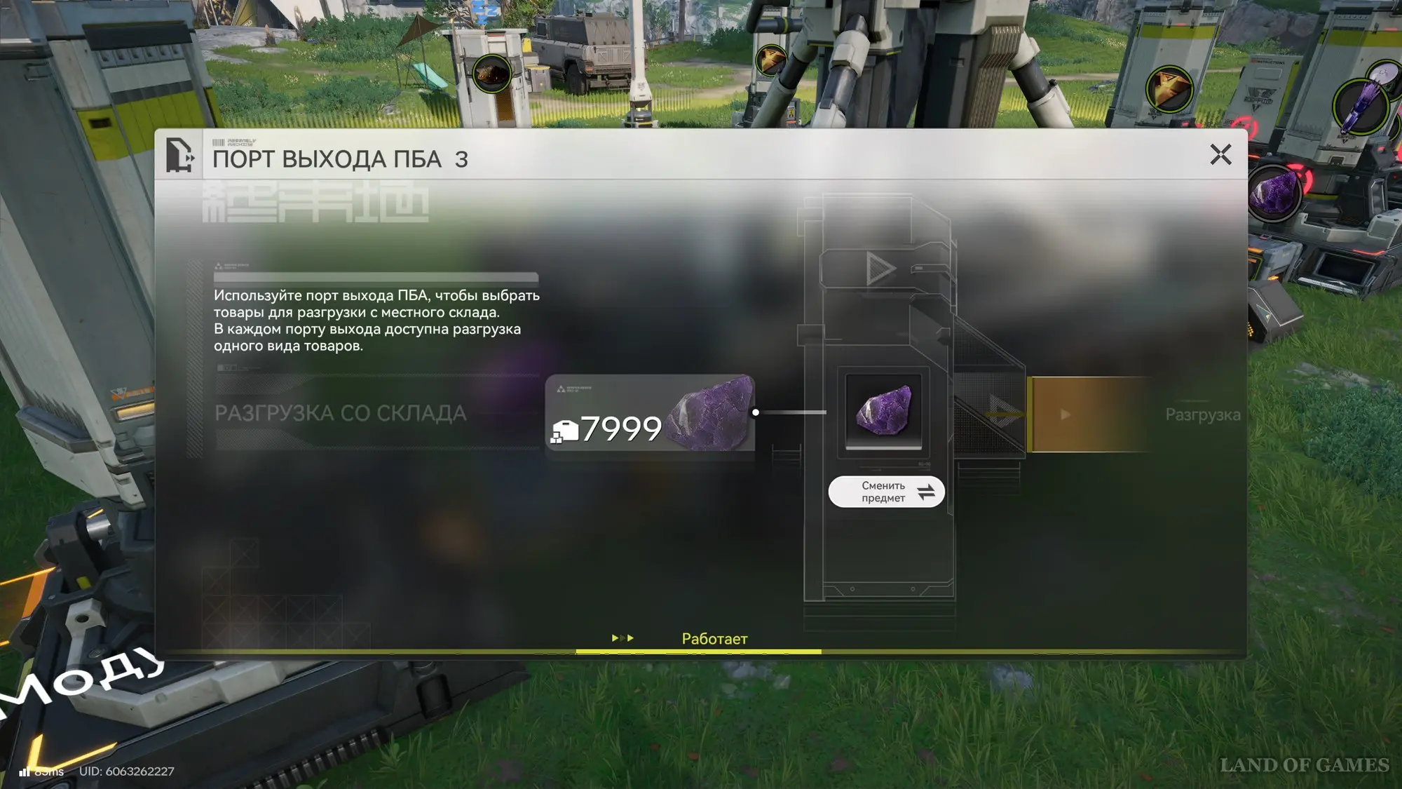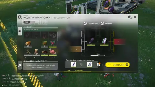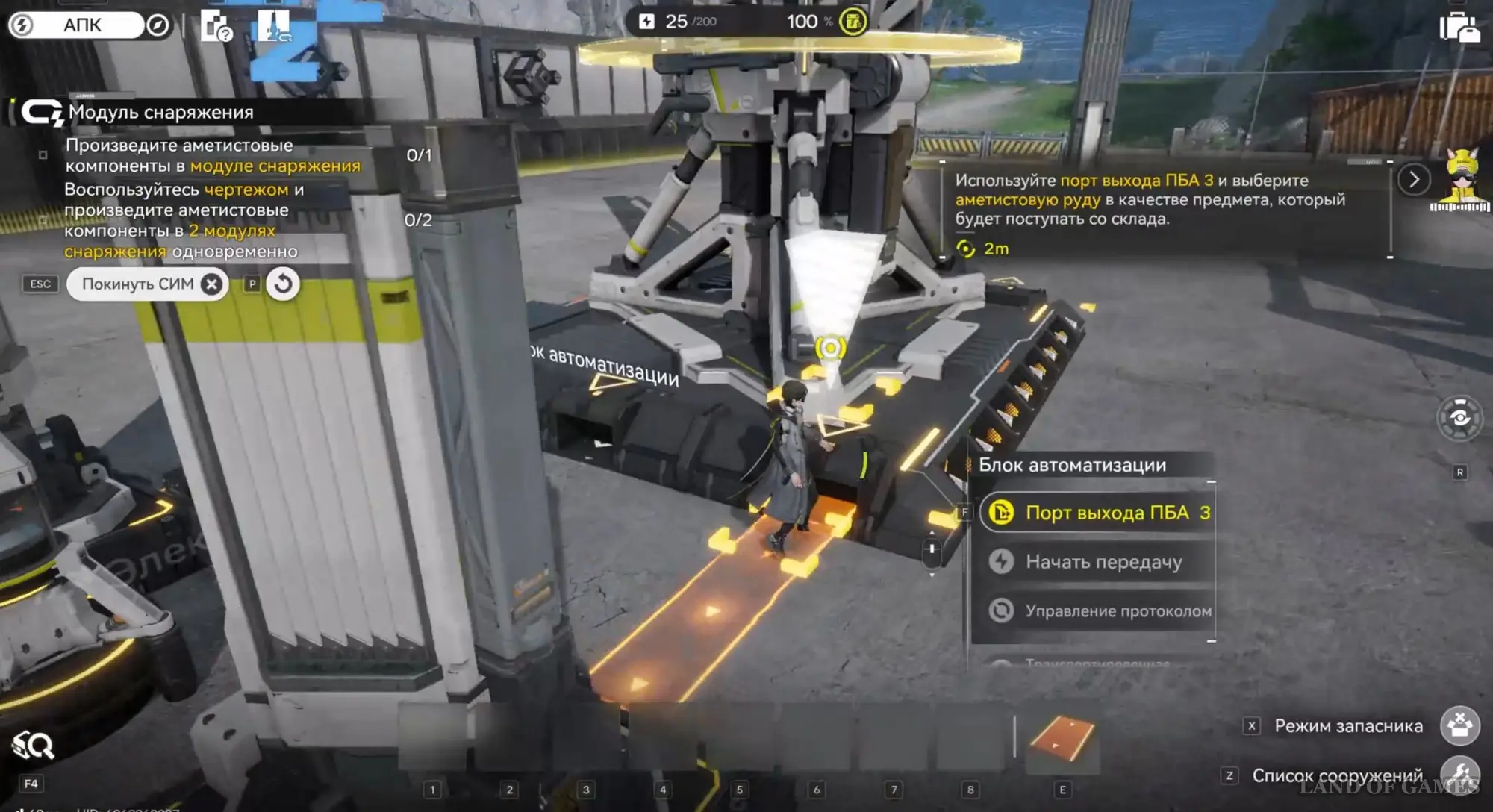 Затем нажмите на клавишу «Y», чтобы открыть экран ПБА и взглянуть на склад. Далее возвратитесь в ключевую область АПК с помощью зиплайна. Вы увидите, что аметистовая руда перемещается на склад, поэтому пришло время ее переработать. Для этого необходимо начать ее перемещение с хранилища в модуль очистки с помощью транспортировочных лент – просто подойдите к блоку автоматизации, выберите порт и укажите аметистовую руду. Все остальное будет происходить без вашего участия.
