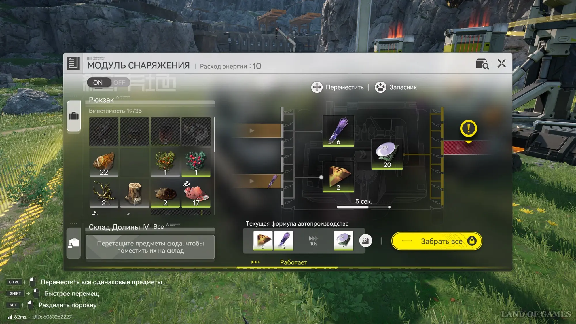 Теперь дождитесь накопления 50 единиц аметистовой и ориджиниевой руды соответственно, а потом зайдите в зону АПК, откройте рюкзак (клавиша «В») и перетащите в него указанные материалы со склада. Передайте их Андре.