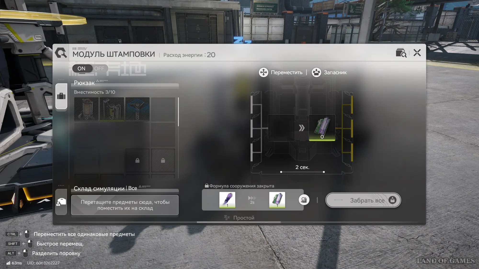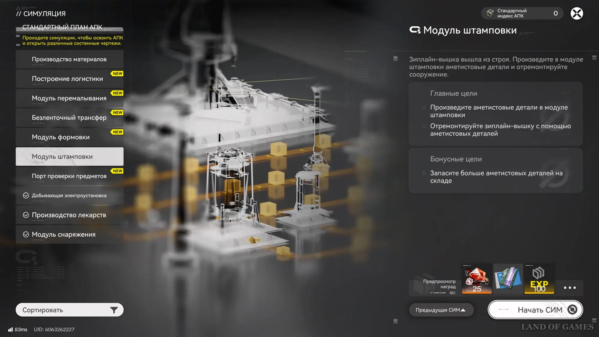 Теперь выберите необходимую симуляцию и примитесь за ее прохождение. Первым делом взаимодействуйте с модулем штамповки, чтобы узнать из чего делаются аметистовые детали. Для этого вам потребуются аметистовые волокна, поэтому понадобится модуль очистки.