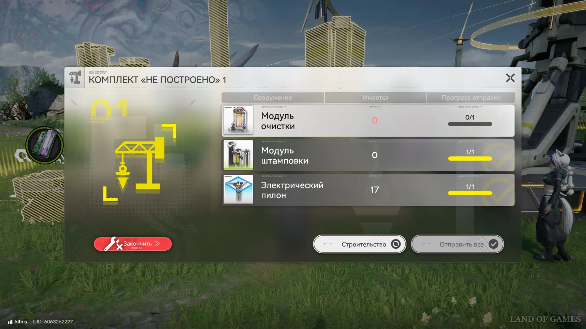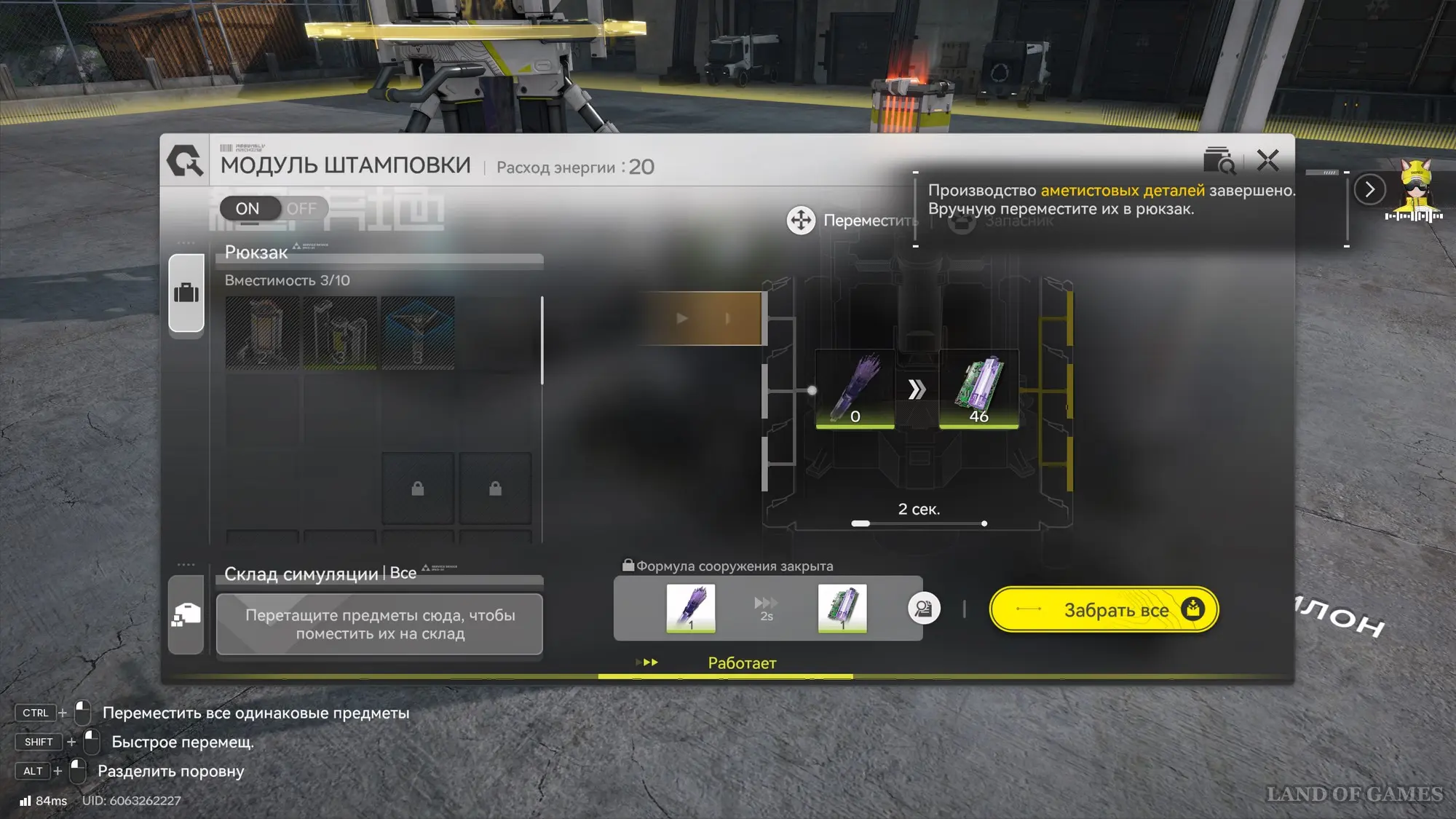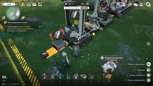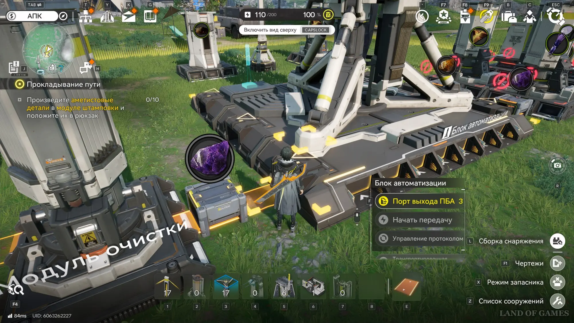 Откройте раздел «Строительство», выберите модуль очистки и создайте хотя бы один. Затем вернитесь в прошлое меню и нажмите на кнопку «Отправить все». В результате все сооружение будет построено. Для его запуска подойдите к порту ПБА и поместите туда аметистовую руду. Далее дождитесь создания 10 аметистовых деталей.