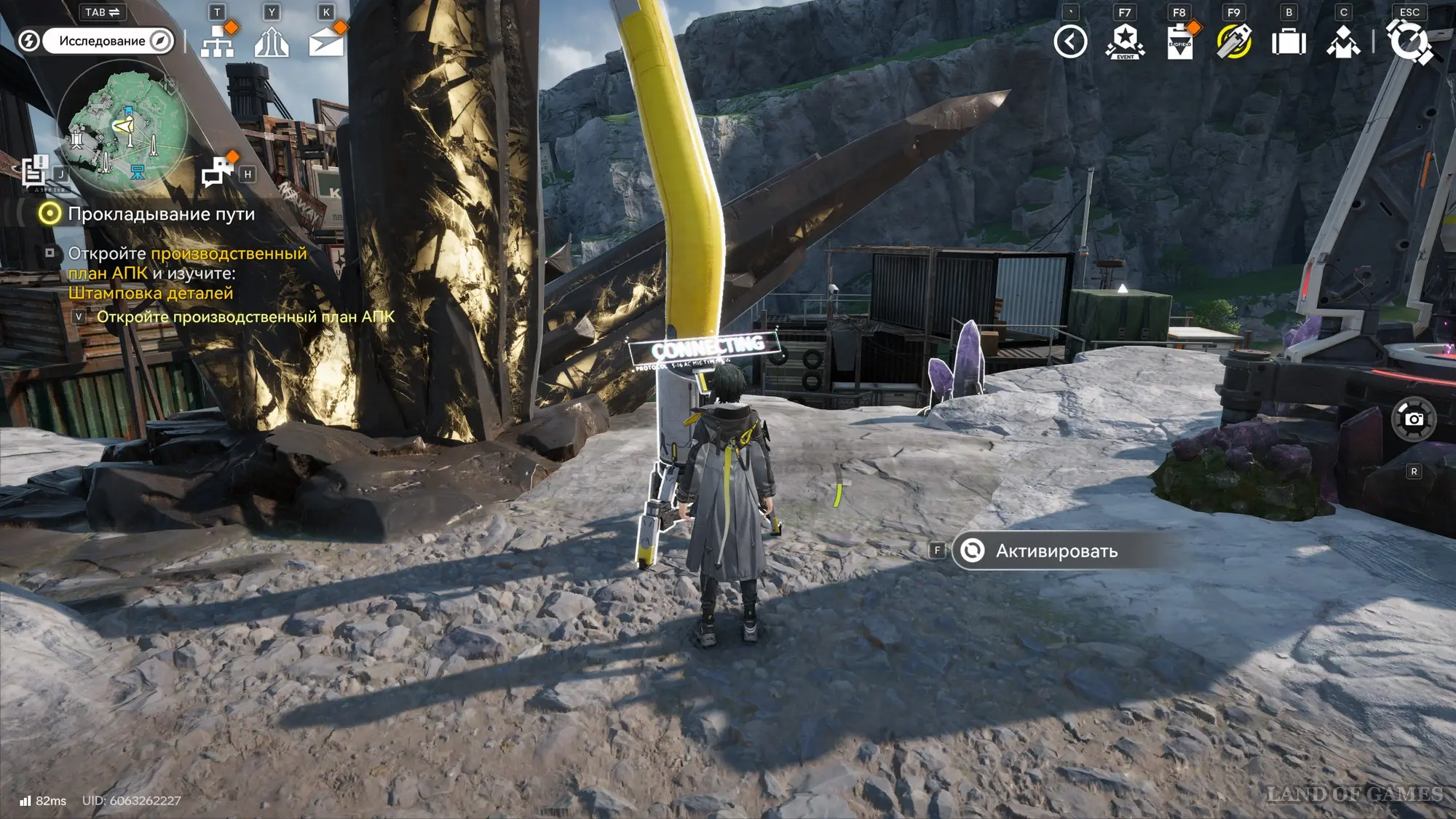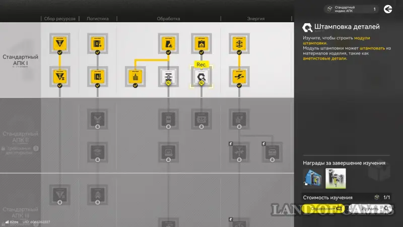 Теперь выйдите из симуляции и отыщите ближайший протокольный регистратор для получения очков АПК (мы показали его на скриншотах ниже). Потом изучите «Штамповка деталей» в производственном плане. Далее вам предстоит заняться производством аметистовых деталей на своей базе.