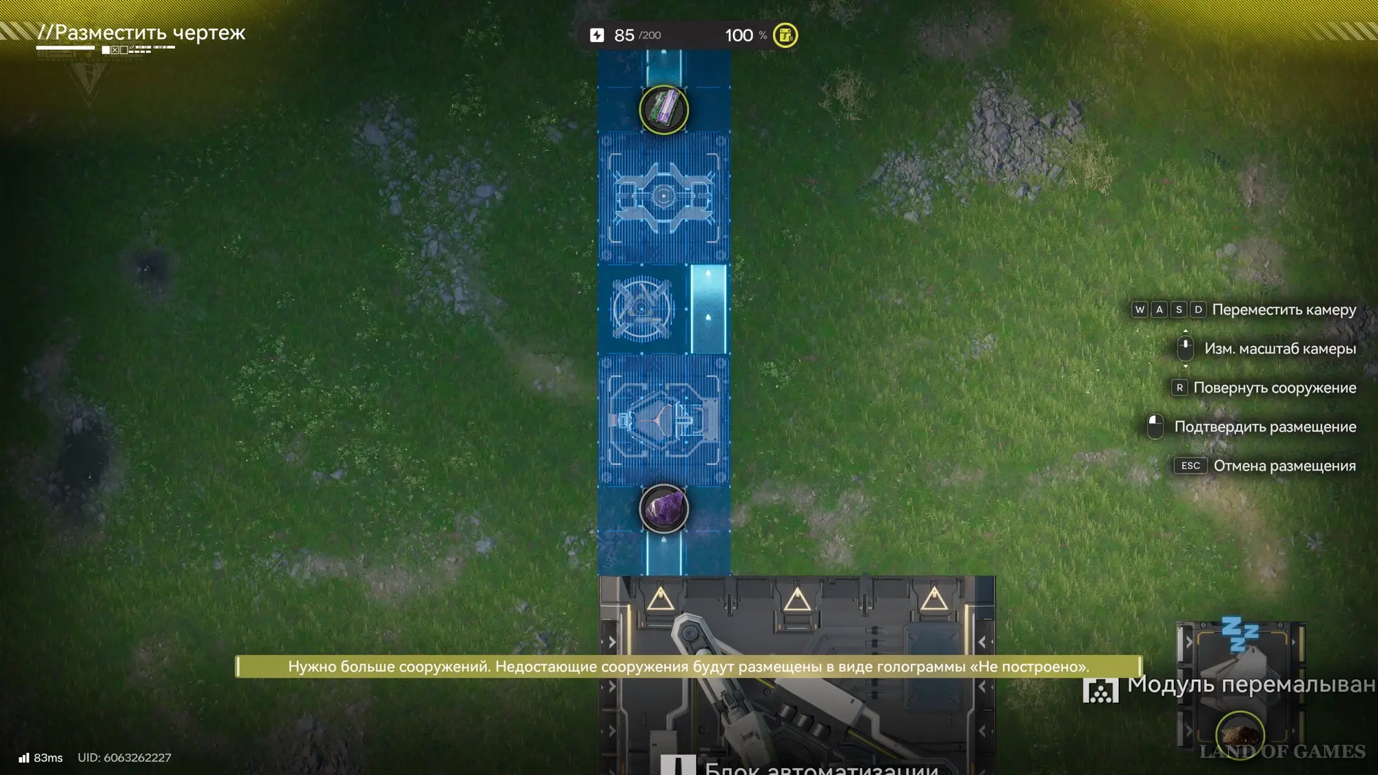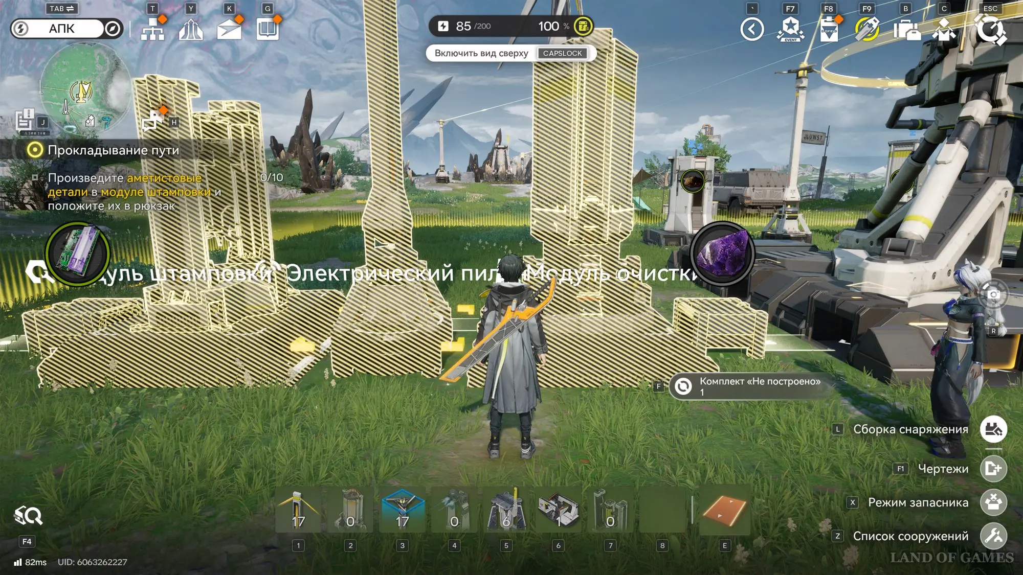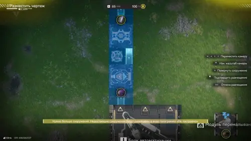 Отправляйтесь в зону АПК, а потом откройте меню чертежей (F1), выберите схему «Аметистовые детали» и разместите ее так, как показано на картинке ниже, то есть вплотную к порту выхода ПБА. С большой вероятностью у вас не будет хватать одного модуля, поэтому вместо сооружения вы получите голограмму – подойдите к ней и взаимодействуйте, чтобы узнать чего не хватает.