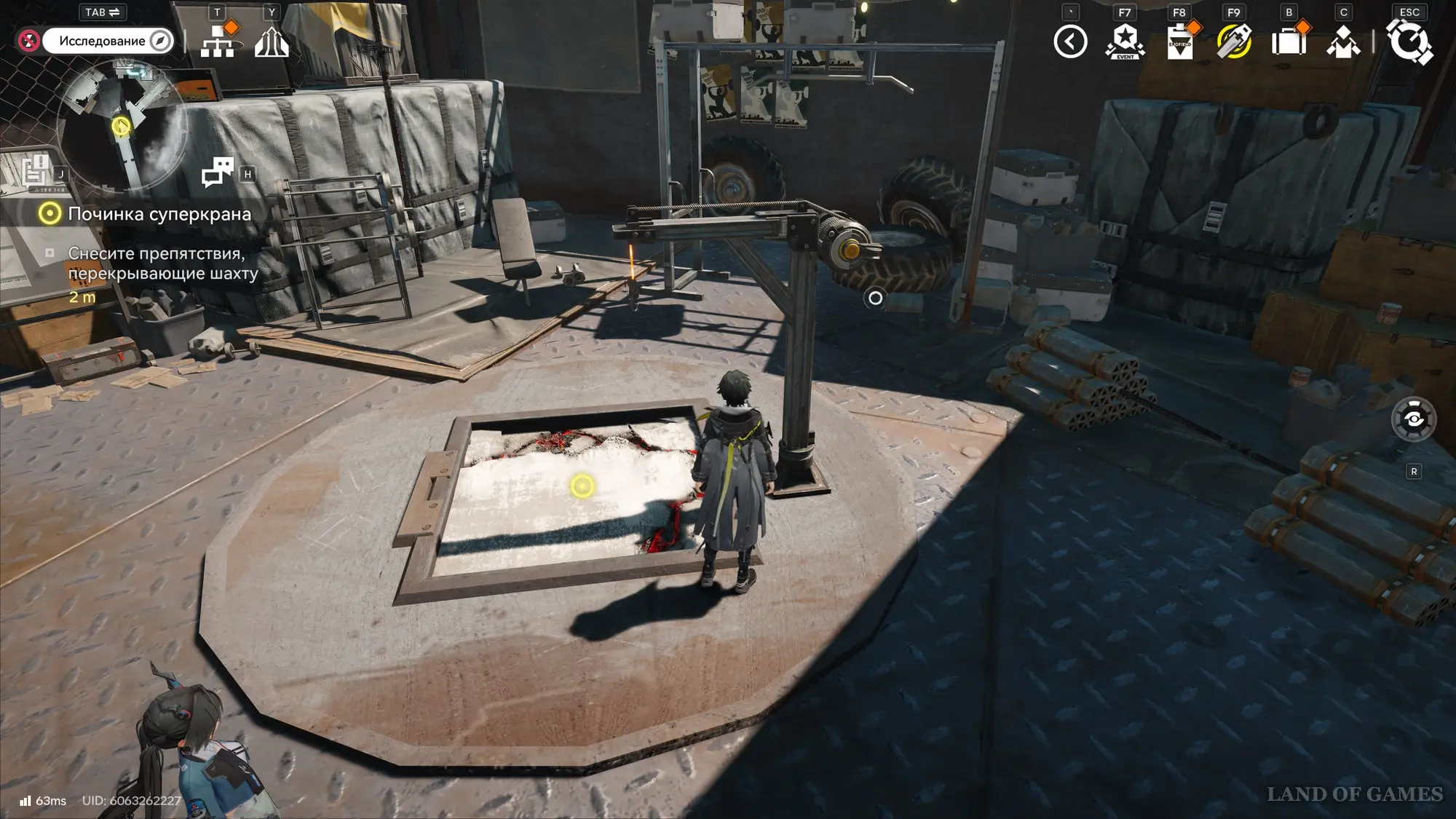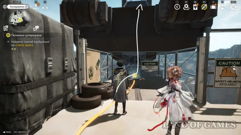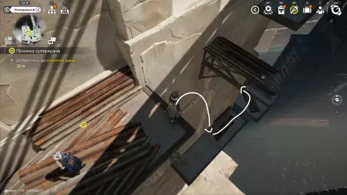 Начните бежать по стреле крана вперед, пока не дойдете до самого конца. Затем подойдите к бочке с взрывчаткой, возьмите бомбу и киньте ее в люк, чтобы убрать препятствие, перекрывающее шахту. Взаимодействуйте с тросом и спуститесь вниз, а затем вновь побеседуйте с Рамоном.
