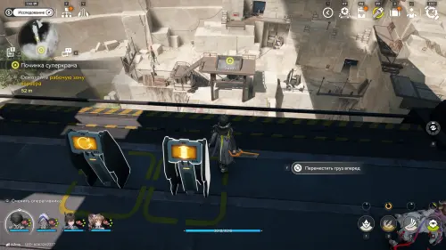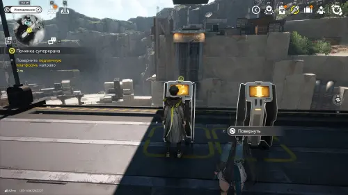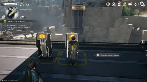 Продолжайте спускаться ниже, расправляясь по пути с противниками. Будьте осторожны и не используйте рывки необдуманно, иначе вы можете слететь с площадки прямиком в карьер, из-за чего вашего персонажа принудительно возвратят к контрольной точке возле суперкрана. Дойдя до терминала, поверните площадку на 90 градусов ровно 3 раза, чтобы создать своеобразный трамплин, как показано на скриншоте ниже.