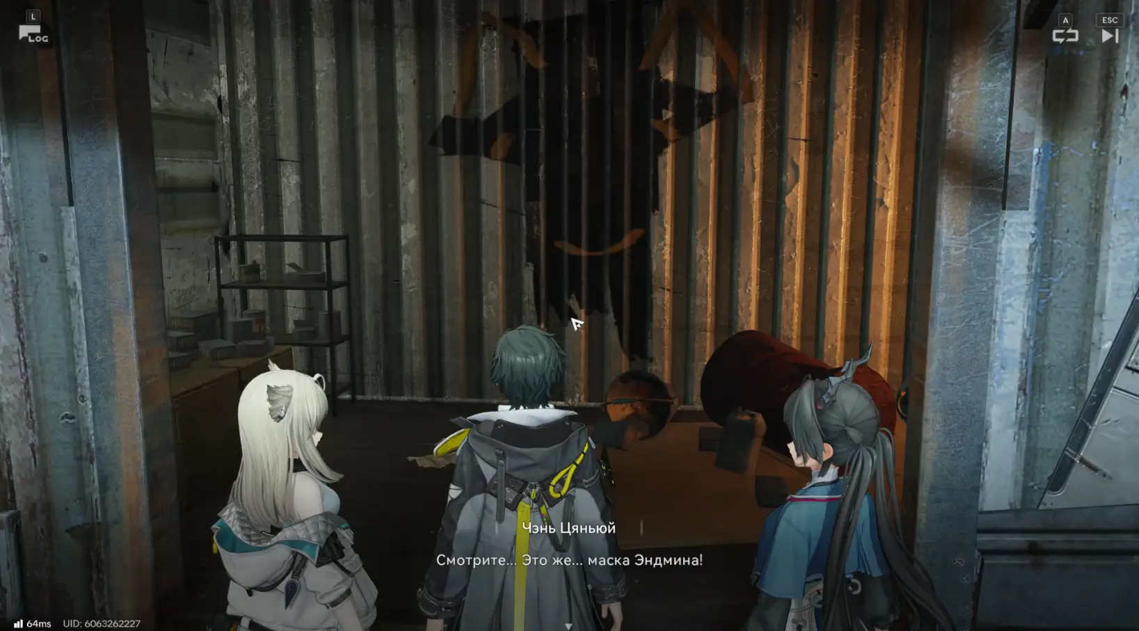 Продолжая путь, вы доберетесь до двухэтажного здания рядом с ТП. Поднимайтесь на второй этаж, чтобы внутри ветхого контейнера обнаружить рисунок маски Эндмина. При приближении автоматически запускается кат-сцена.