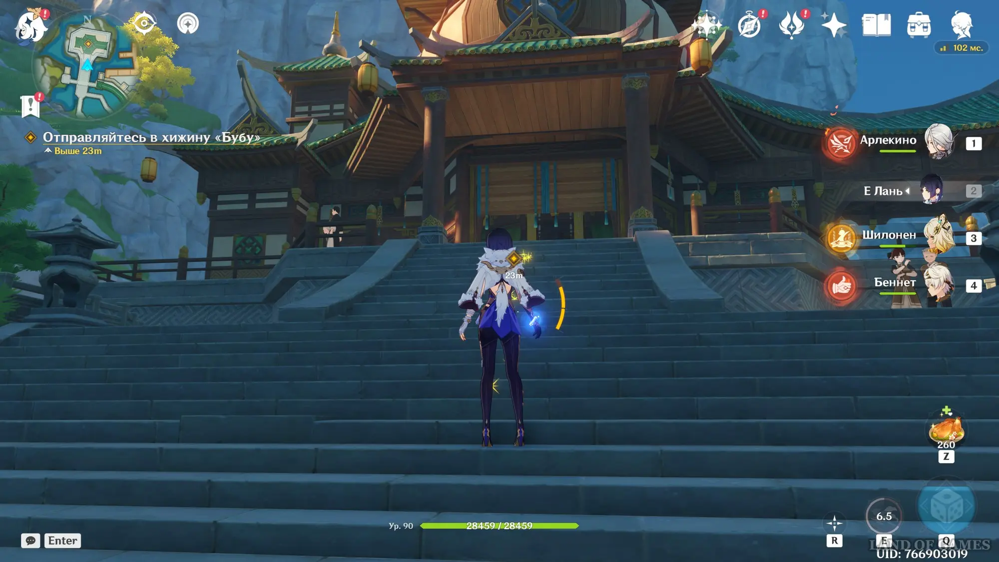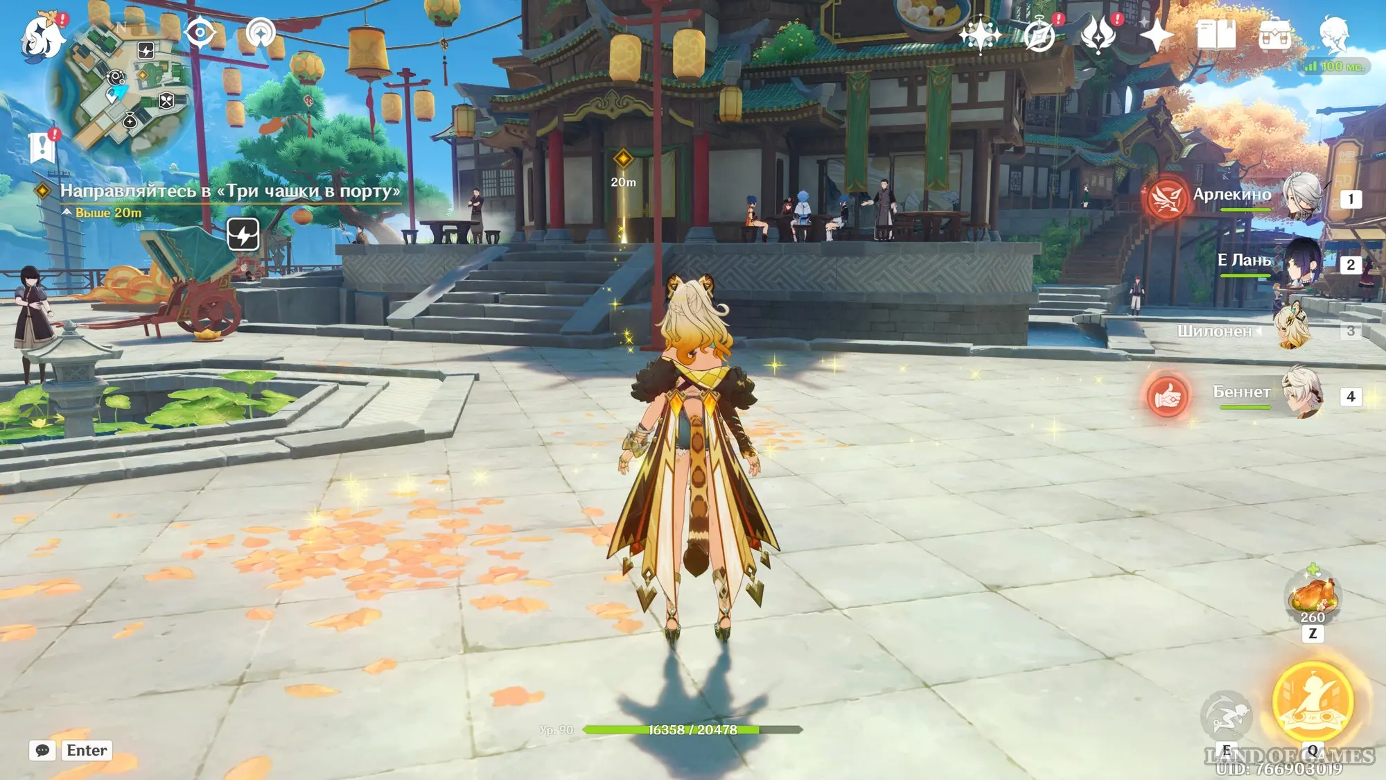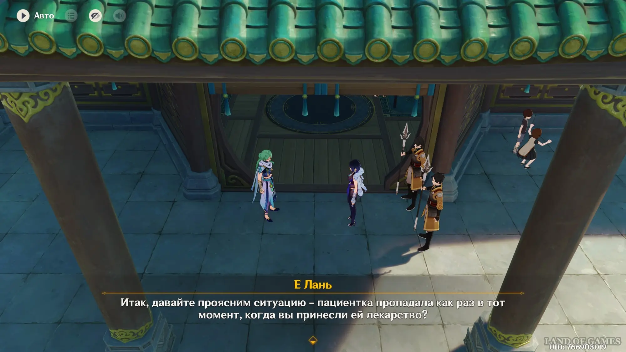 Поговорив с ними, направляйтесь на террасу Юйцзин и пообщайтесь с находящимися тут Нин Гуан, Кэ Цин и Лань Янь. Узнав нужную информацию, отправляйтесь в хижину «Бубу», чтобы узнать о состоянии безумной девушки. Потом доберитесь до выставки, организованной в портовой зоне, и поговорите с Манму, чтобы перейти на корабль.