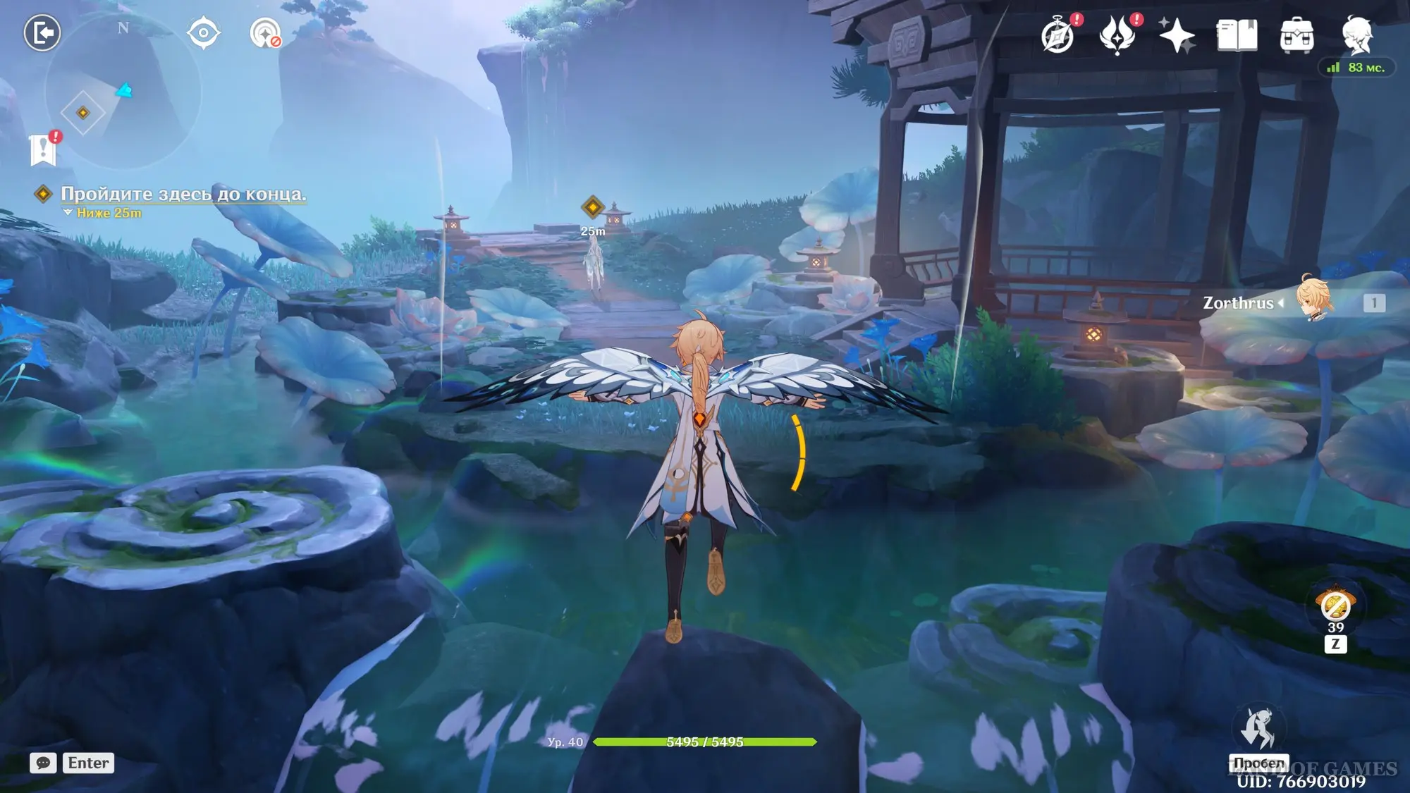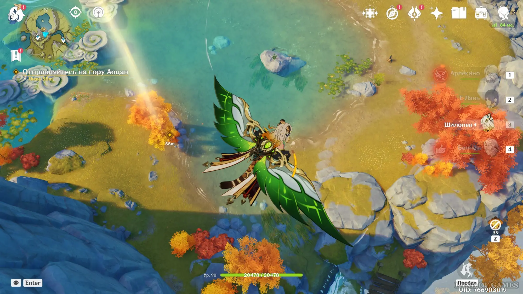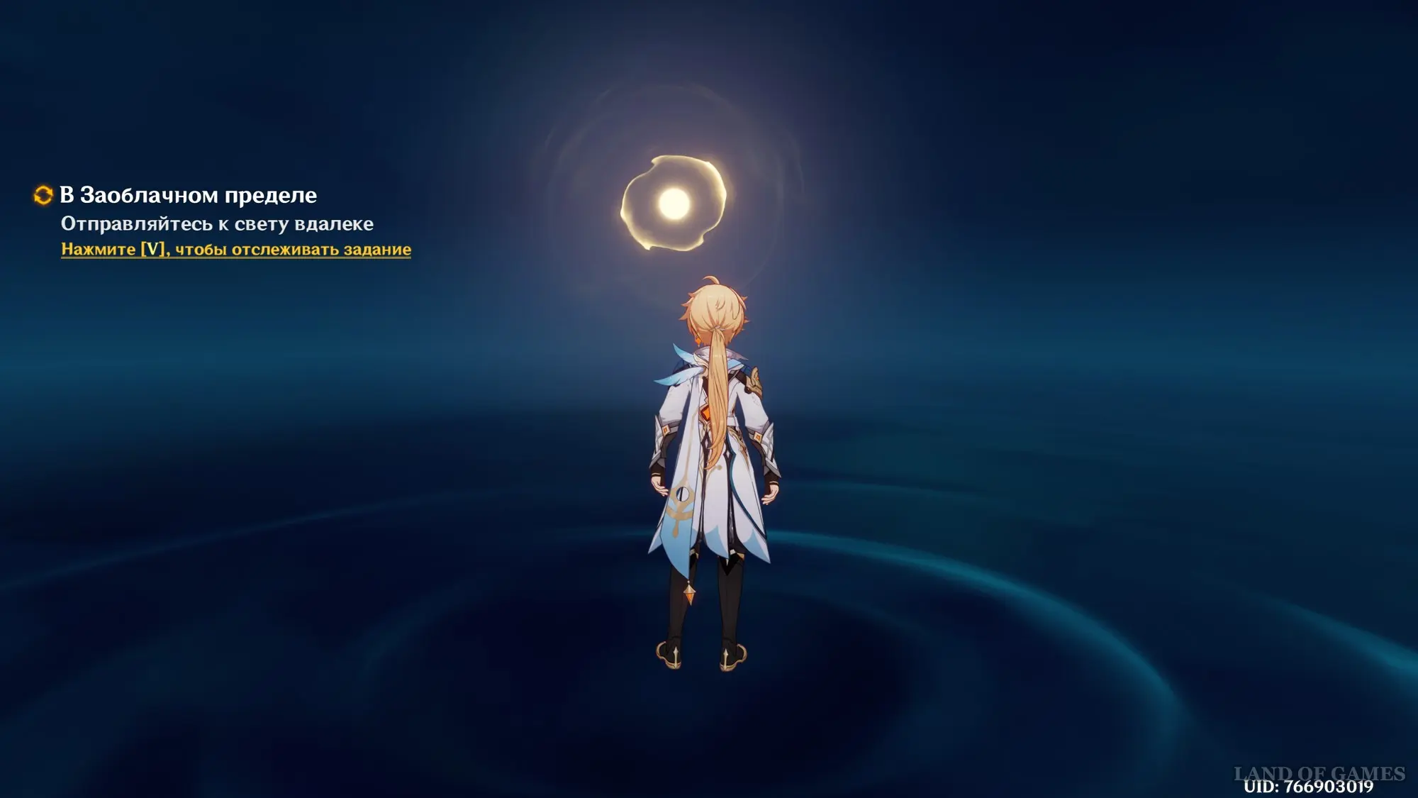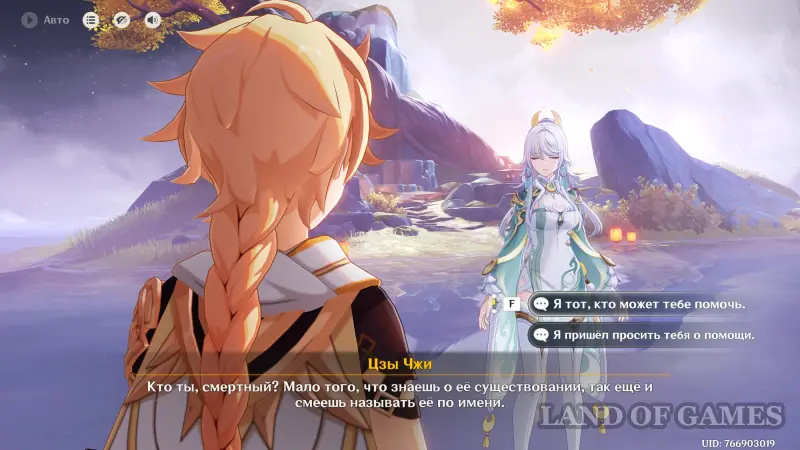 Гляньте длинный ролик, а потом вернитесь в город и отыщите Адептов рядом с дворцом. После очередного разговора переместитесь на Гору Аоцан и найдите Творца Гор рядом с водоемом. В итоге смертная сущность вселится в Путешественника. Поболтайте с ней в ее темнице – можете выбирать любые ответы.