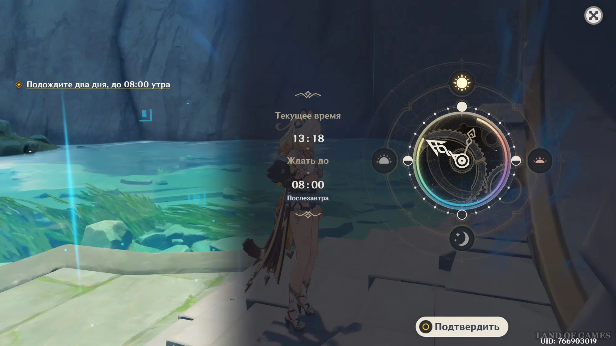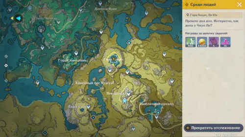 Подождите два игровых дня, прокрутив время на 08:00 с помощью меню Паймон, а затем направляйтесь на гору Аоцан. Здесь пообщайтесь с Адептами. Получив сообщение от Чжун Ли, отправляйтесь в горы Цинцэ и подойдите к водопаду. В итоге вы окажетесь в другой локации. Пройдите вперед и посмотрите новую сценку.