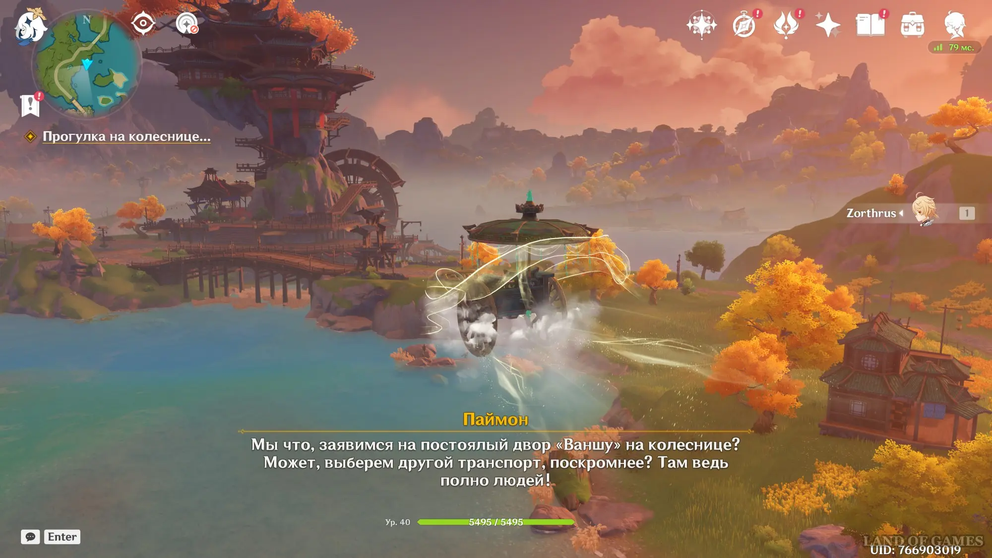 Подождите два игровых дня, прокрутив время на утро с помощью меню Паймон, а затем пройдите в «Три чашки в порту» и ресторан «Народный выбор», глянув забавный ролик с Цзы Бай. После этого отправляйтесь в Порт Илун, расположенный в долине Чэньюй. Придя в нужное место, сядьте на колесницу и прокатитесь вместе с Адептом.