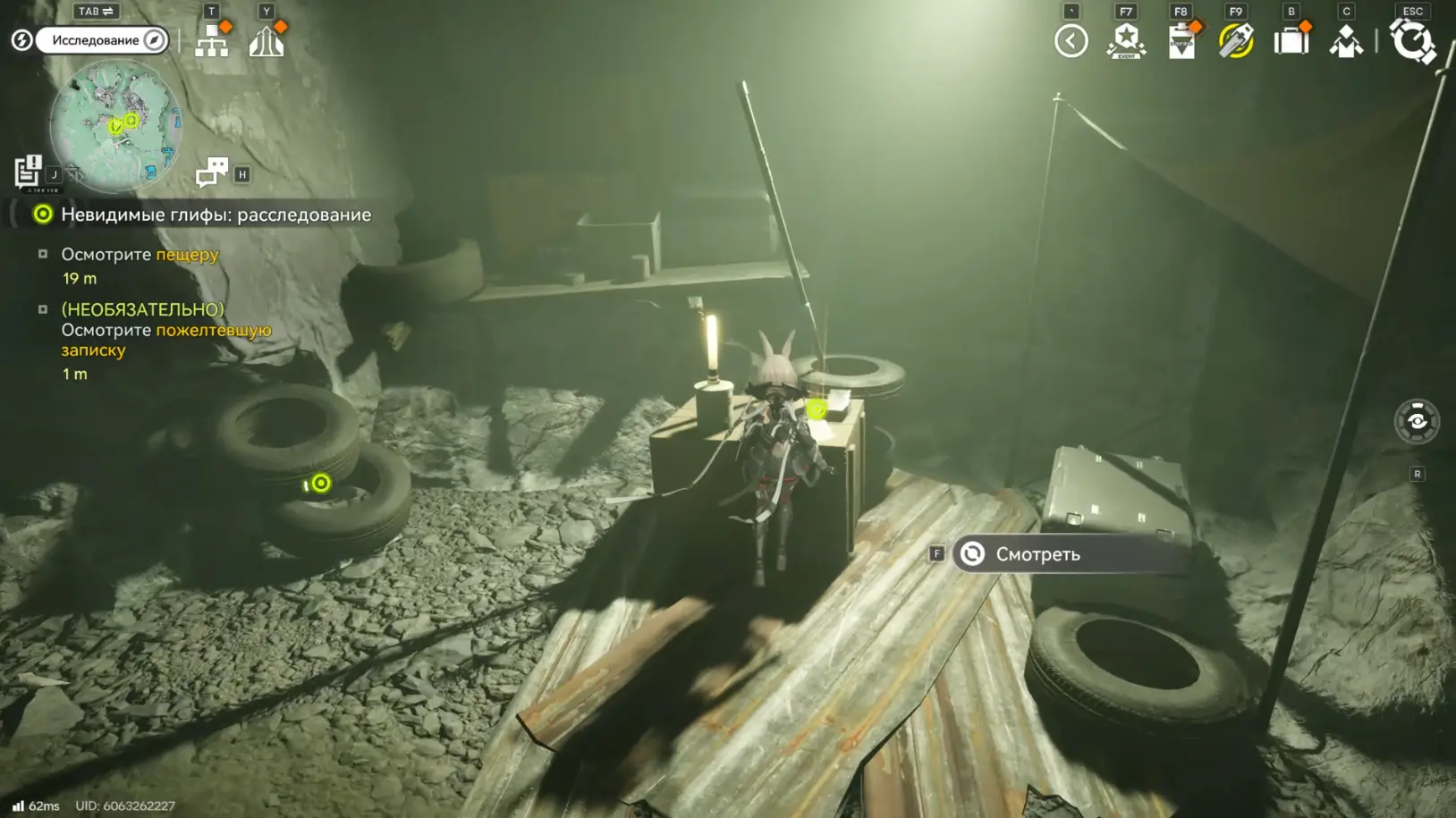 Войдите в пещеру и продвиньтесь внутрь, попутно осматривая подсвеченные предметы.