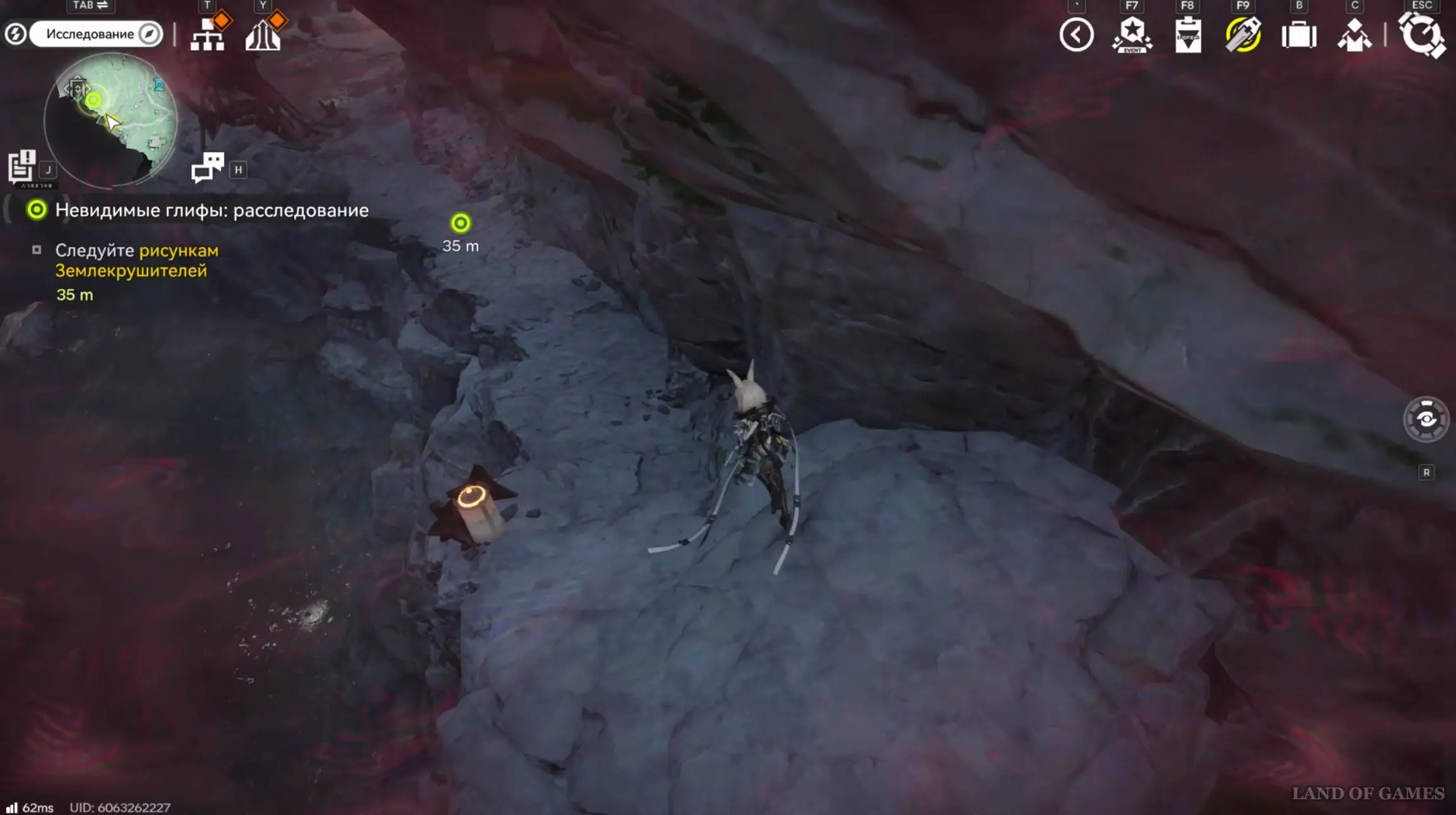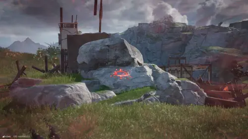 После сцены цель задания изменится, теперь нужно следовать за граффити Землекрушителей. Осмотр каждого рисунка не влияет на прогресс миссии, поэтому самый быстрый способ – просто двигаться по основному маркеру задания. Он приведет вас к лагерю Землекрушителей, расположенному прямо на краю утеса.