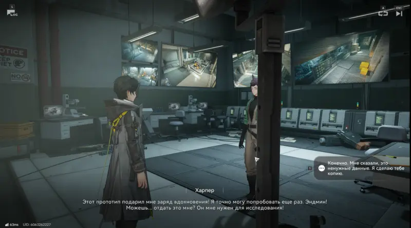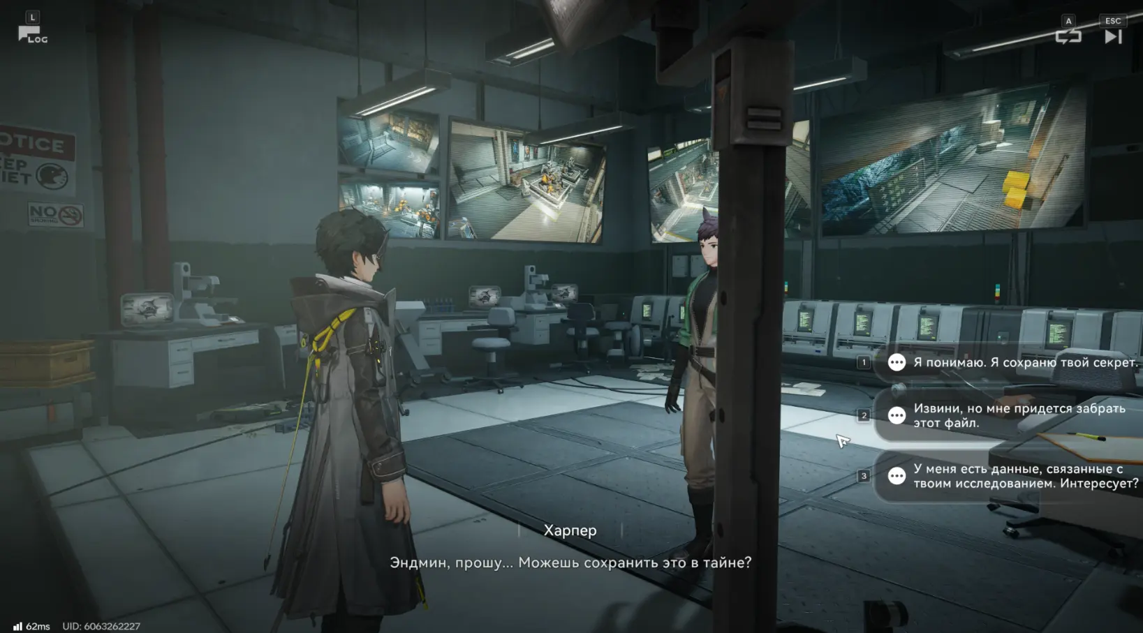 После этого зайдите в диспетчерскую комнату справа, где находится Харпер. Во время разговора вам предложат три варианта ответа: сохранить его секрет, передать собранные данные или поделиться с ним материалами по его исследованиям.