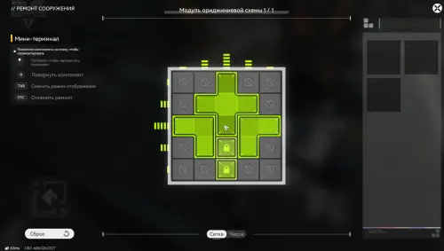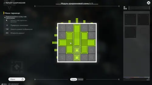 В большой комнате осмотрите столы. Нужный терминал находится на втором столе слева от входа. Взаимодействие с ним запускает головоломку с ремонтом сооружения.