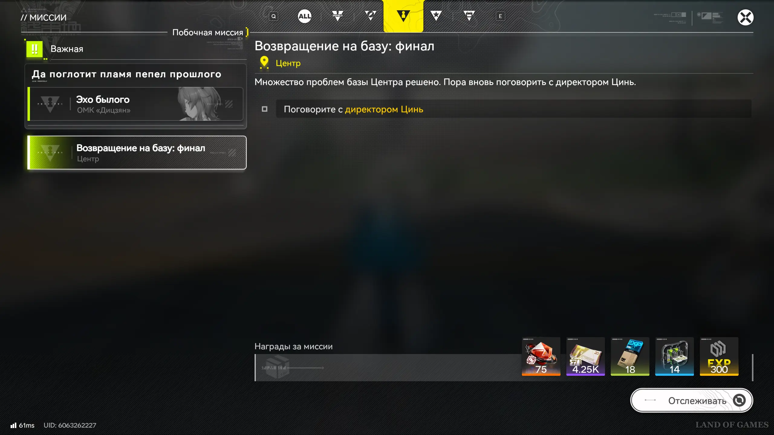 Их действия происходят на территории Базы Центра и связаны с восстановительными работами и спасением персонала. Тем самым вы сможете хоть немного снизить нагрузку на директора Цинь. После их прохождения дождитесь еще одного сообщения от управляющей – она снова попросит вас посетить вышку, что приведет к старту второй части ее миссии.