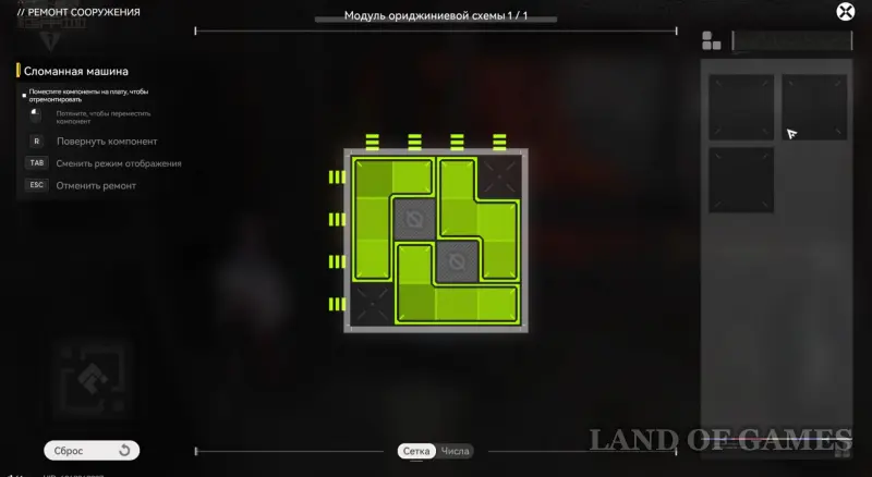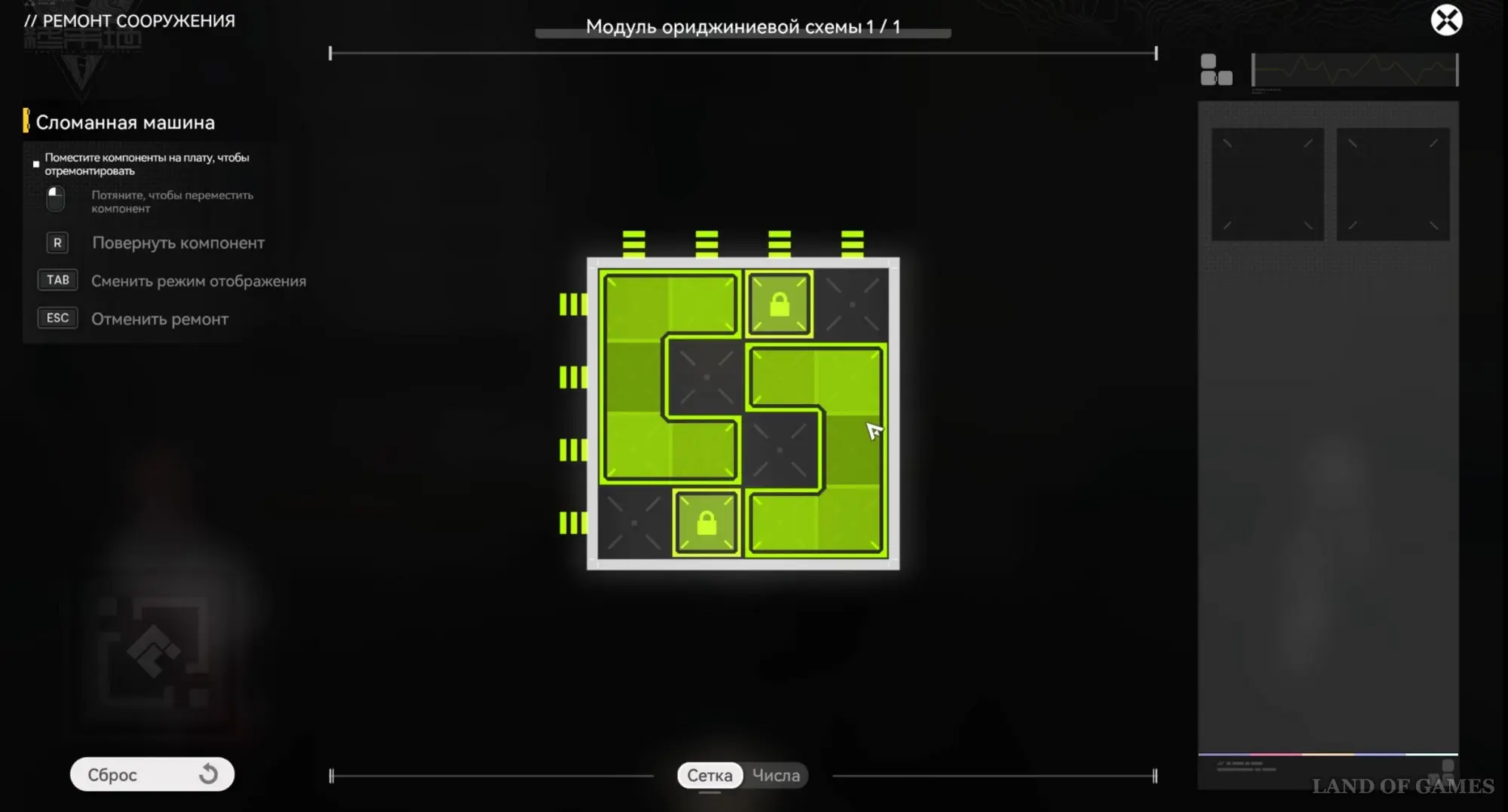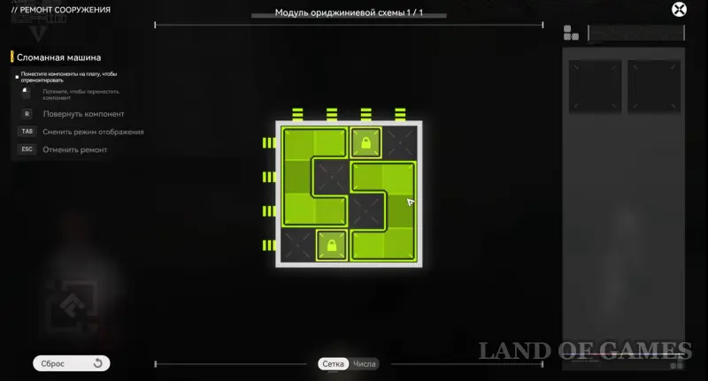 Укройтесь от пара с помощью ящиков и пройдите в просторное помещение. Подойдите к рычагу слева и примитесь за решение головоломки с ориджиниевой схемой. Вам необходимо будет правильно расположить зеленые фигуры на поле – верный вариант показан на скриншоте ниже.