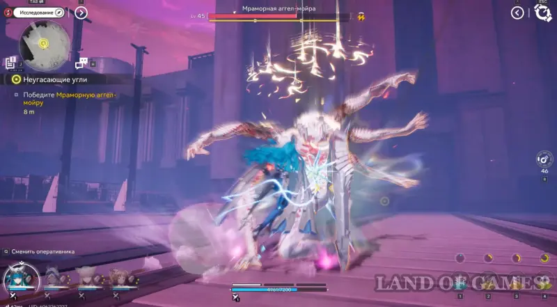 После этого начнется вторая фаза сражения, в рамках которой мраморная статуя оживет и начнет атаковать вас напрямую. Старайтесь уклоняться от ее комбо-ударов (обычно состоят из стрех взмахов копьем) и прерывайте ее заряженные атаки своими боевыми навыками. В определенный момент она взмоет в воздух, и вся арена покроется красным цветом. Дождитесь приземления Мойры и подпрыгните, чтобы не получить урон.