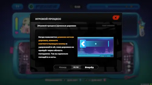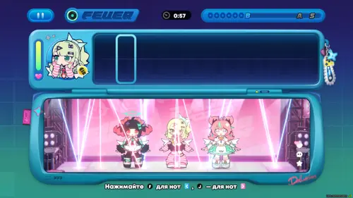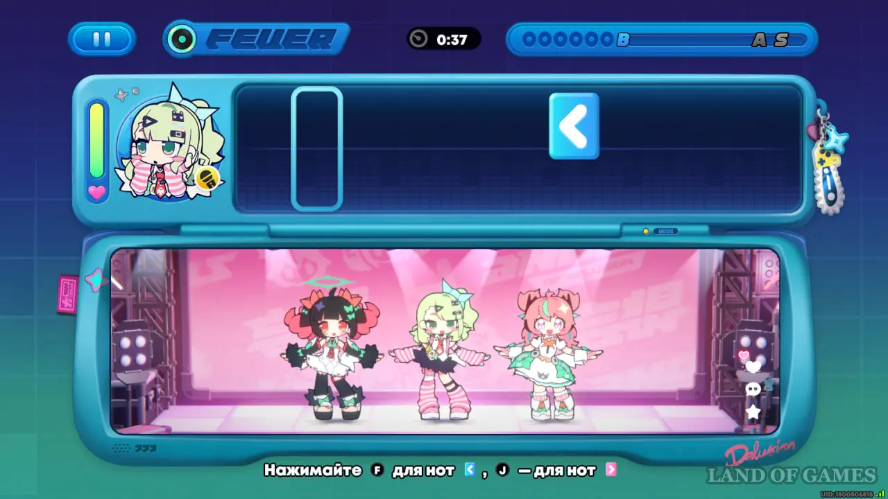 В ритм-игре вам нужно будет нажимать F, когда голубая стрелка будет попадать в прямоугольник в левой стороне экрана, и J, когда туда будет попадать красная стрелка.
