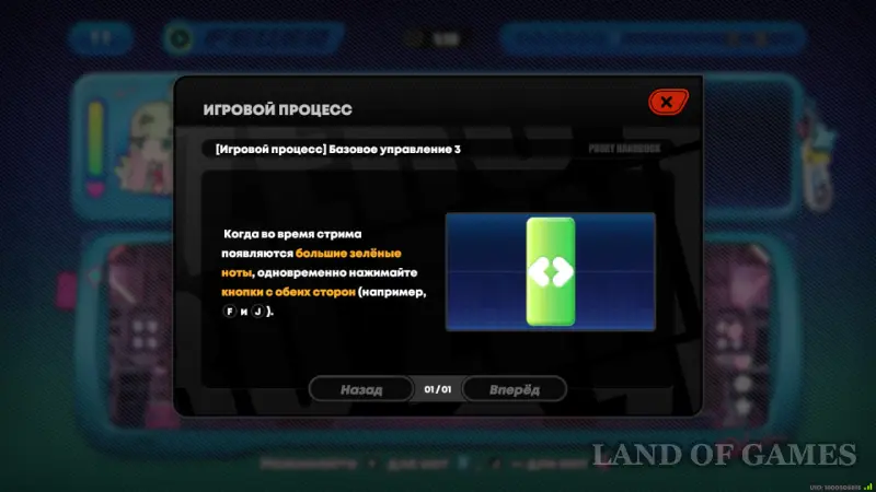 Вновь сыграйте в ритм-игру. В ней появится дополнительная зеленая стрелка — когда она попадет в прямоугольник, нажимайте F и J одновременно.