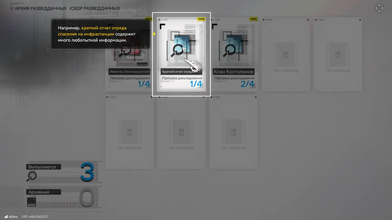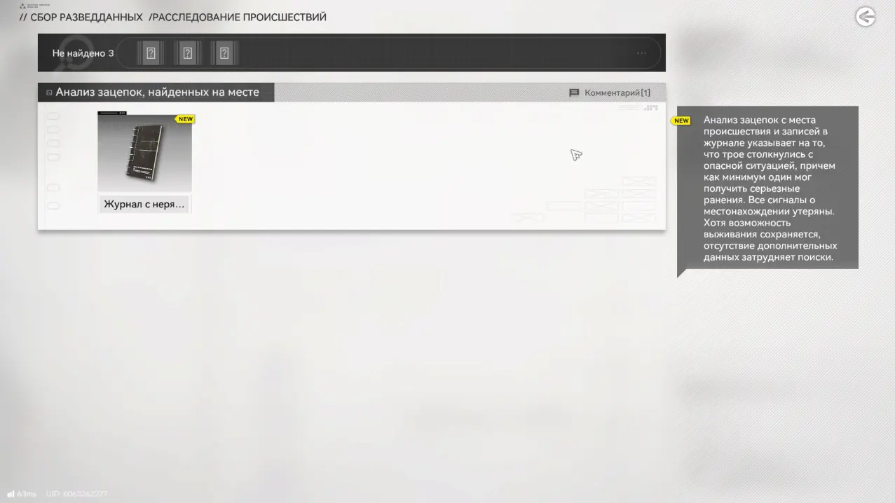 После сбора всех трех улик откройте сбор разведданных в разделе архив разведданных. Необходимо просмотреть комментарии в которых содержится дополнительная информация об инциденте с рабочими, без которой задание не продвинется дальше.