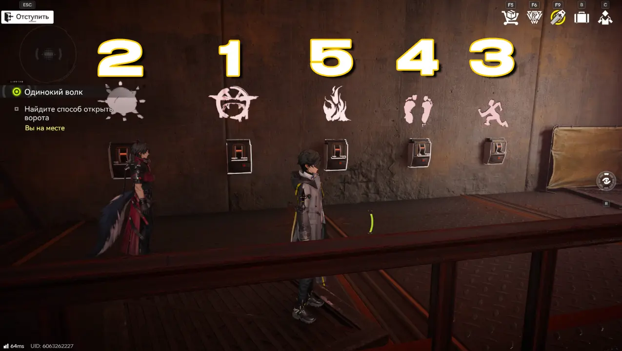 Перед вами ворота и пять переключателей с символами. Осмотрите область и найдите источник дыма.