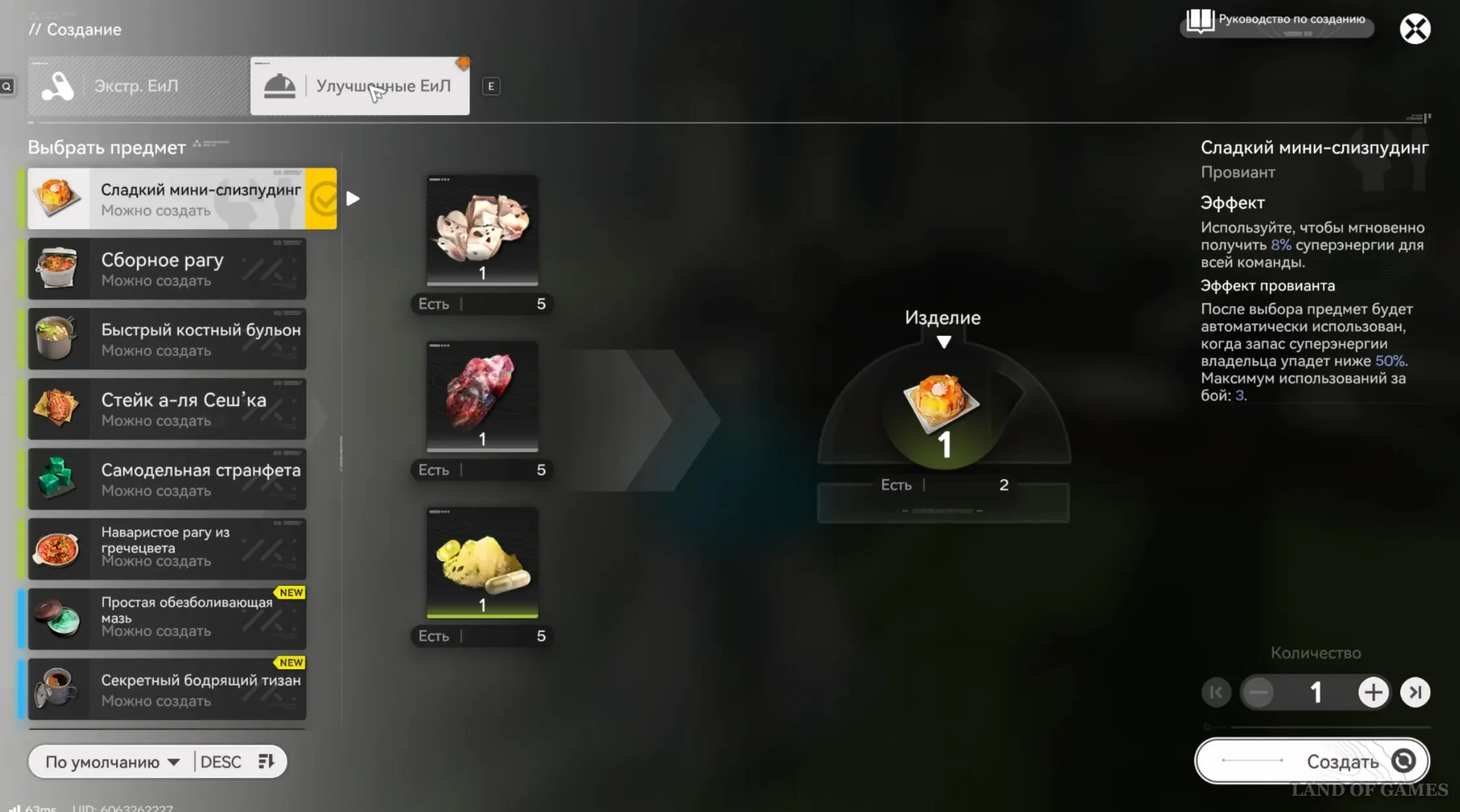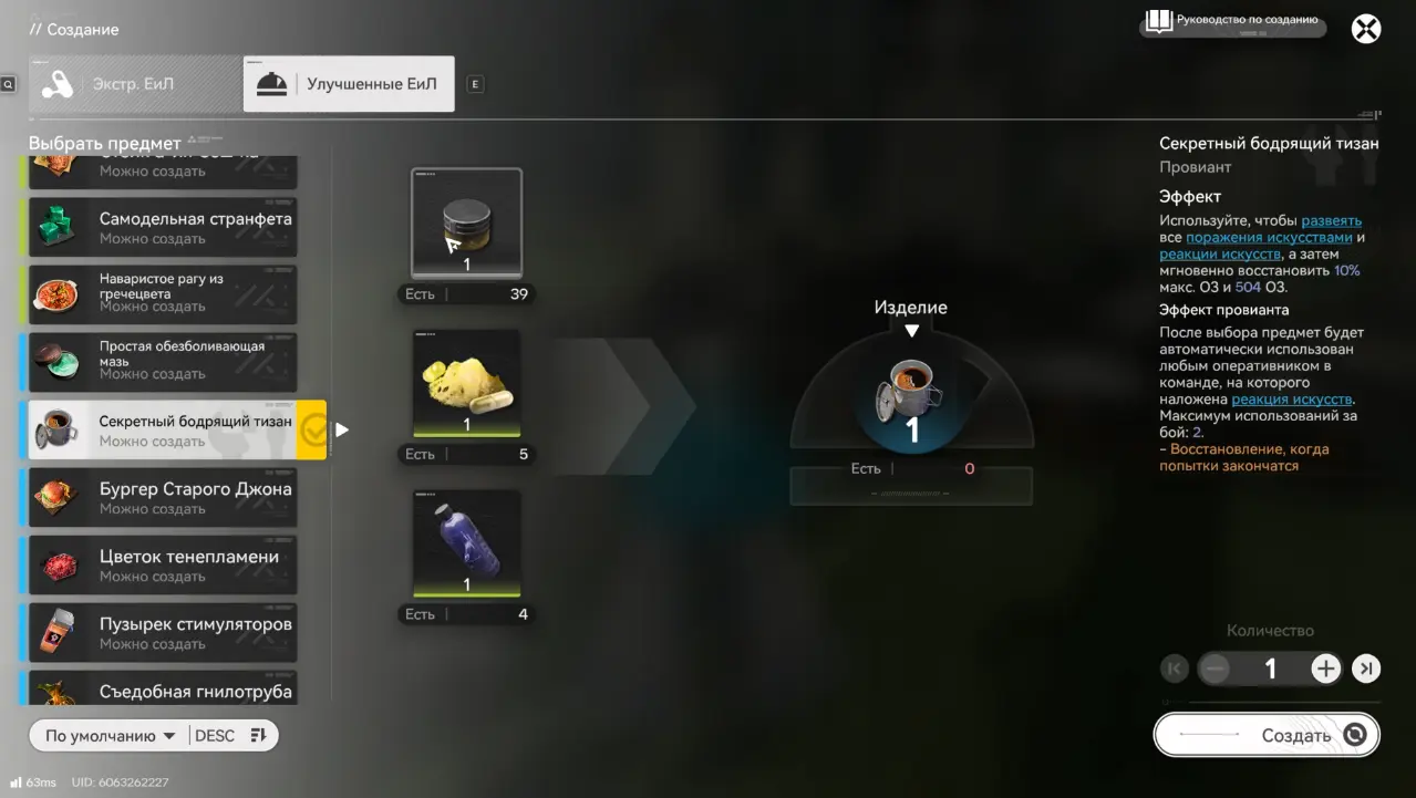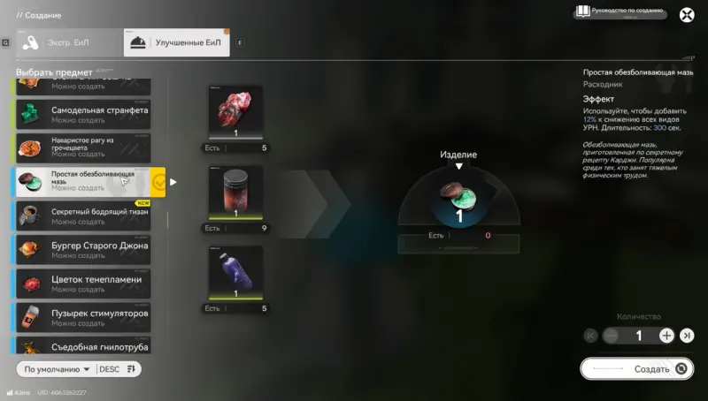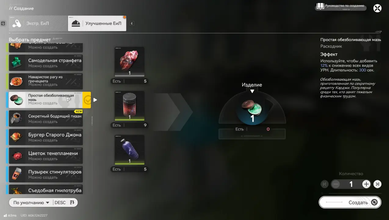 Принцип тот же – соберите ресурсы, создайте предмет через систему крафта во вкладке «Улучшенные ЕиЛ» и убедитесь, что он лежит в инвентаре.