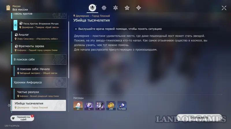 В Honkai: Star Rail (ХСР) Убийца тысячелетия является миссией приключения Двумернии, во время которой вы сможете помочь Эшвейлу и Искре поймать маньяка, ворующего части тела у фантазмов. Для этого вам предстоит собрать улики, а потом установить правду и решить, с кем пойти арестовывать преступника. Если у вас появились трудности с получением и прохождением этого квеста, то изучите наше руководство.