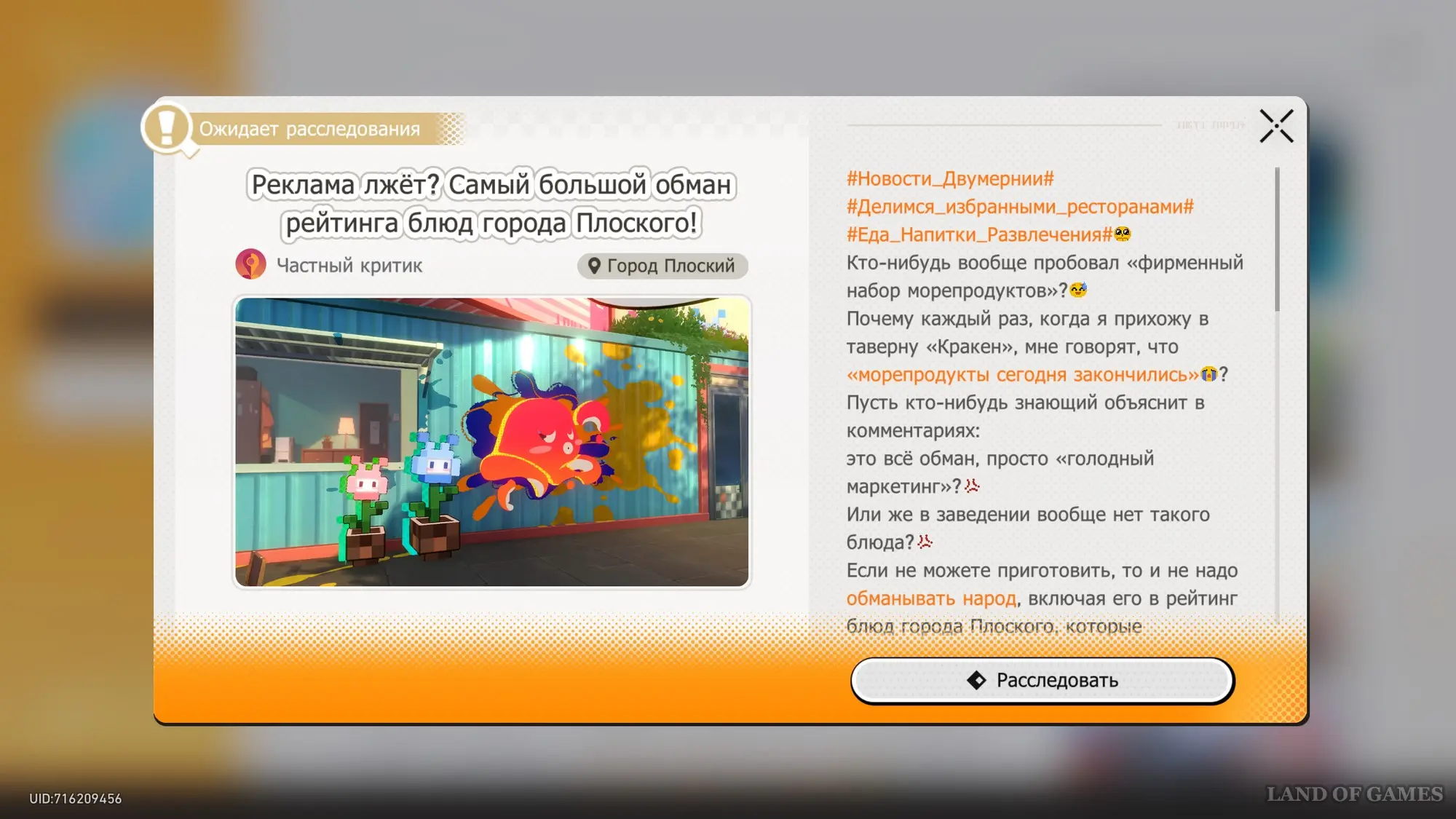 Разобравшись с указанными требованиями, перейдите в Шерстяку Телеком и найдите на Шерстяном портале событие «Реклама лжет? Самый большой обман рейтинга блюд города Плоского», а потом нажмите кнопку «Расследовать» для появления на карте Города Плоский иконки вопроса с соответствующим заданием.