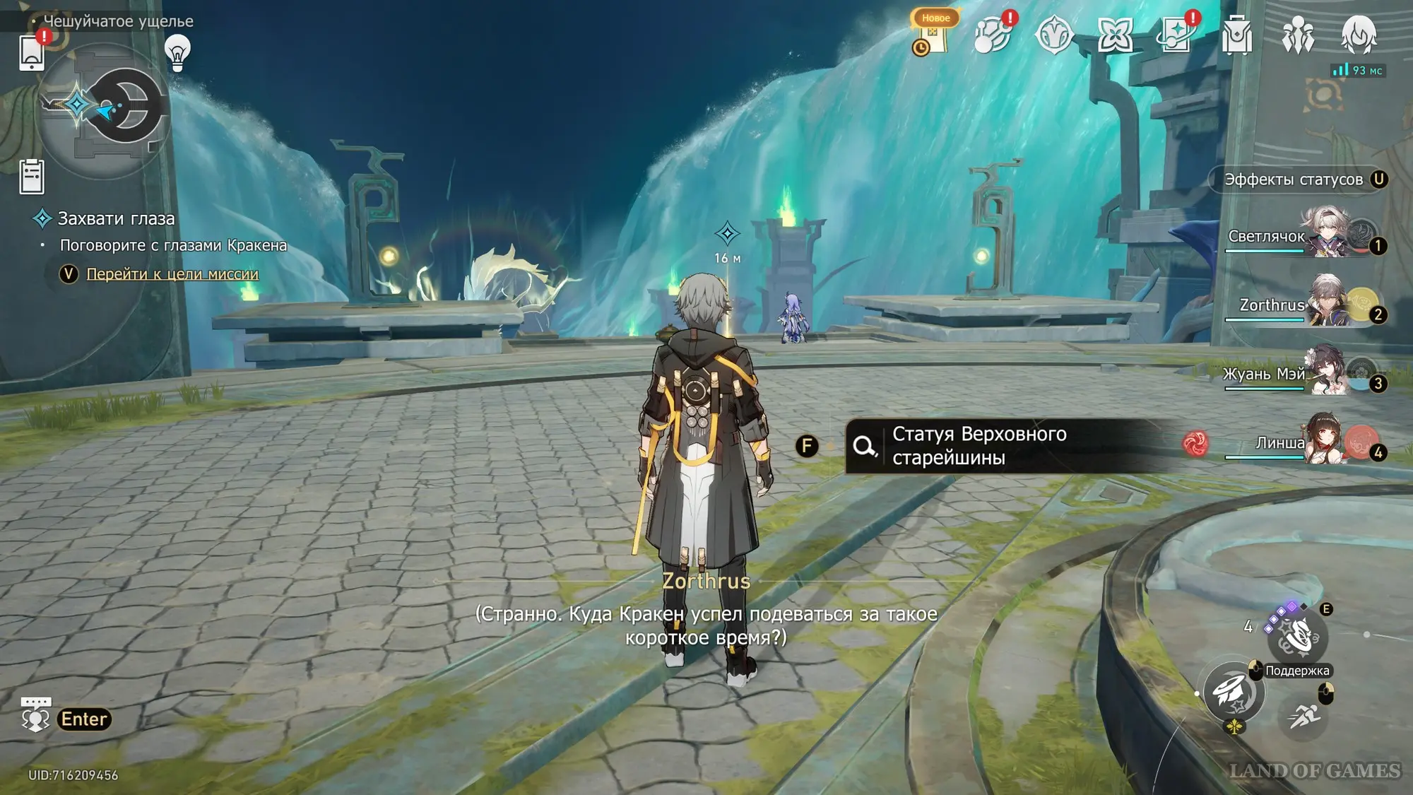 Затем вы автоматически переместитесь в Белобог. Подойдите к фонтану в Административном районе и снова побеседуйте с Кракеном. В конце вы отправитесь в Чешуйчатое ущелье в Лофу Сяньчжоу. После разговора с граффити, возвратитесь в Город Плоский и верните глаза на место. На этом задание подойдет к концу.