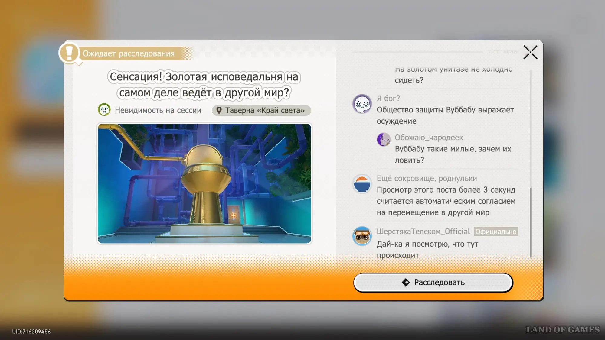 Разобравшись с указанными требованиями, перейдите в Шерстяку Телеком и найдите на Шерстяном портале событие «Сенсация! Золотая исповедальня на самом деле ведет в другой мир?», а потом нажмите кнопку «Расследовать» для появления на карте Таверны «Край света» иконки вопроса с соответствующим заданием.