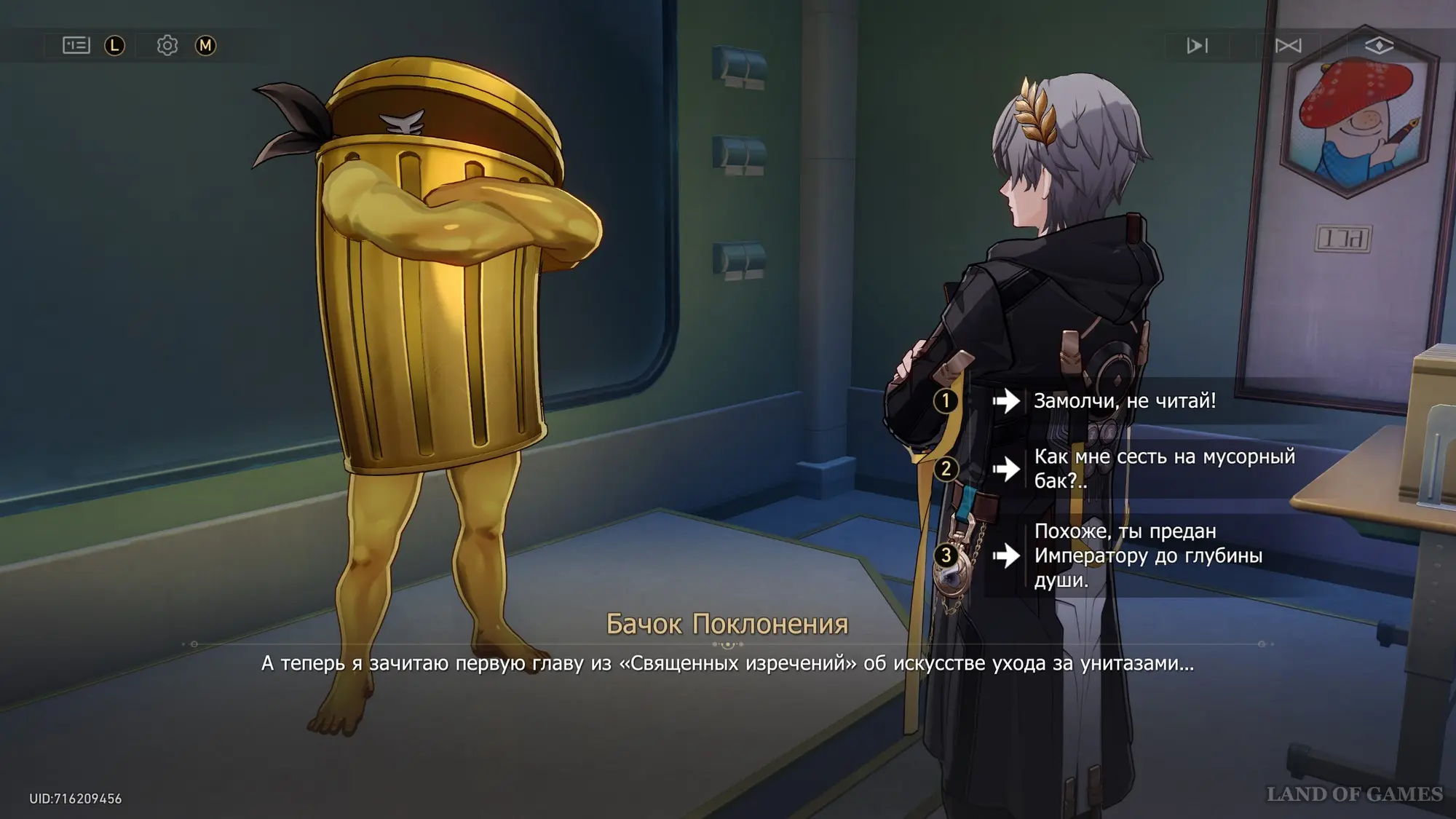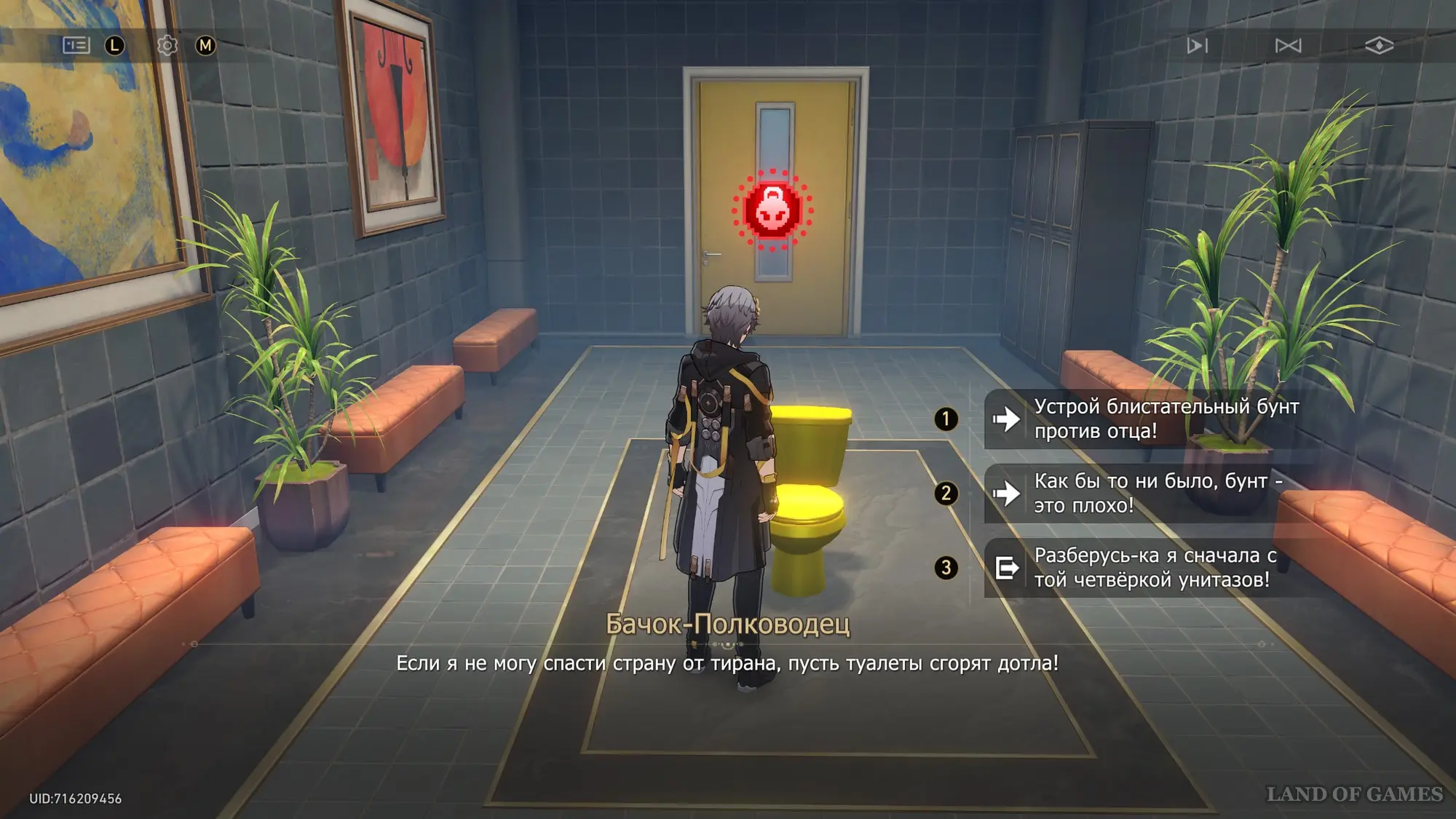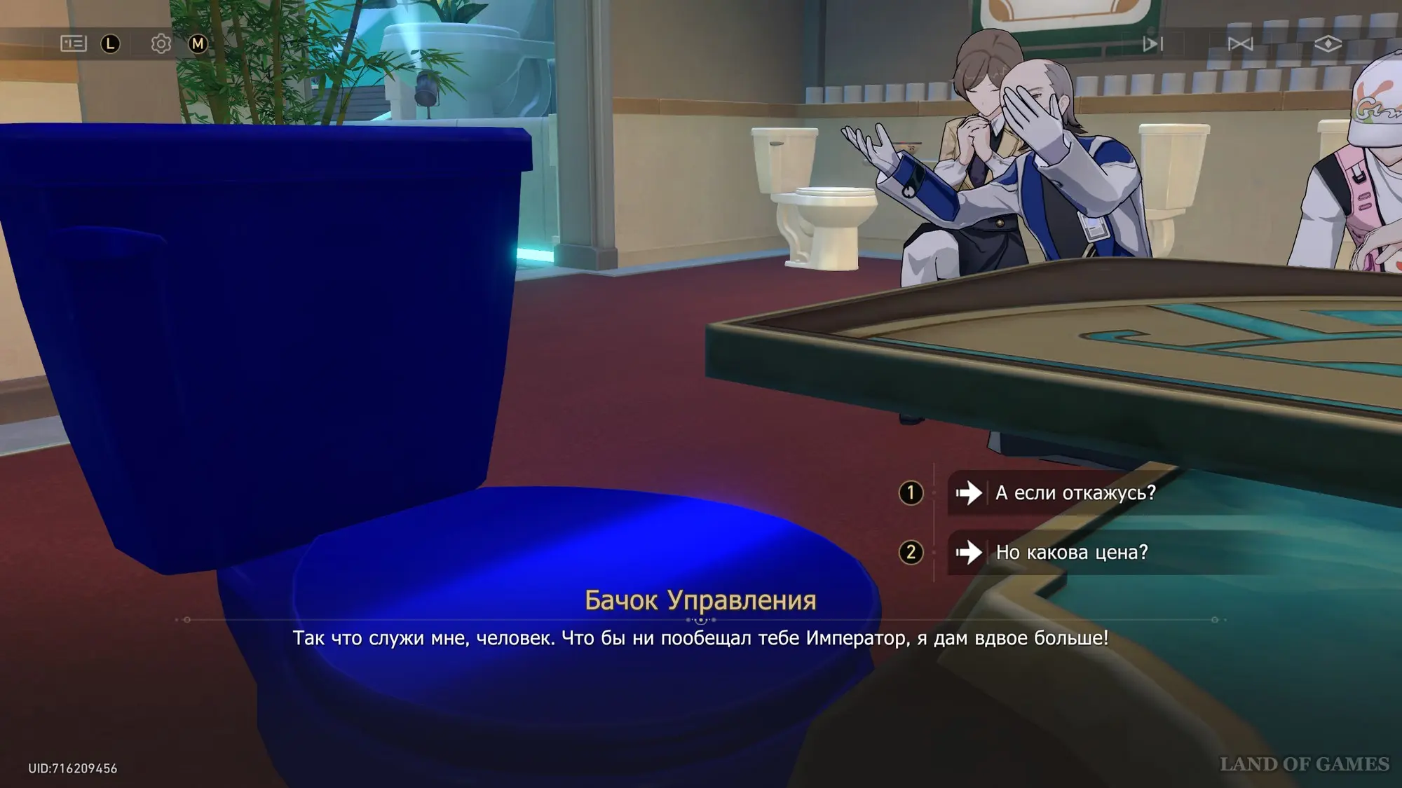 Пройдите в комнату позади Императора и поговорите с золотым унитазом. Далее вы можете сказать: