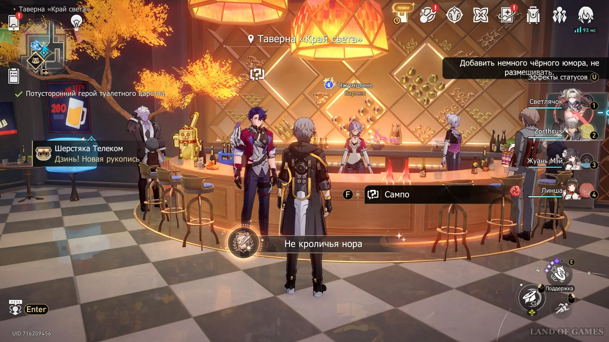 При любом ответе вы возвратитесь в лобби таверны и поговорите с Чжуншань. Можете сказать ей, что угодно. После разговора с девушкой, вы тут же получите секретное достижение «Не кроличья нора». Плюс, вам выдадут стандартную награду: 10 звездных нефритов, 4 конденсированных эфира и 5000 кредитов.
