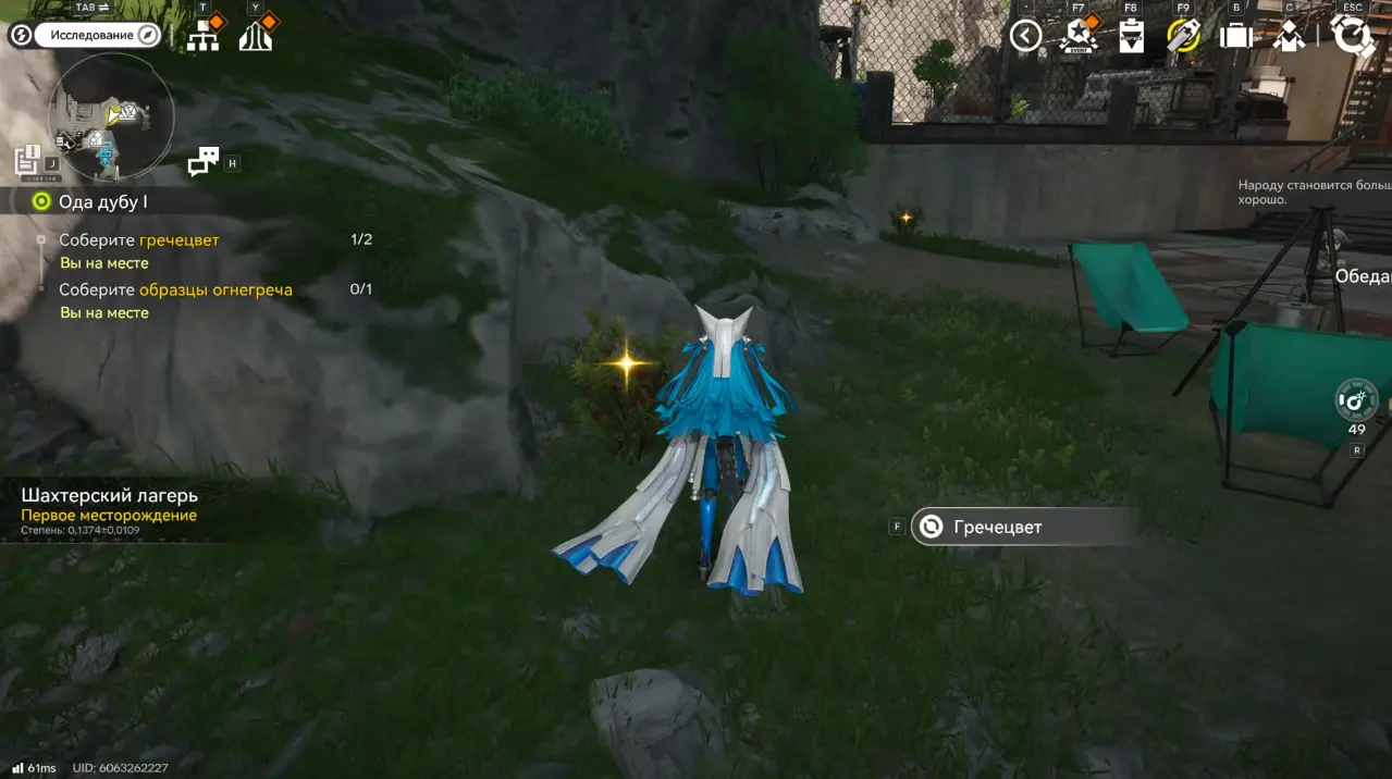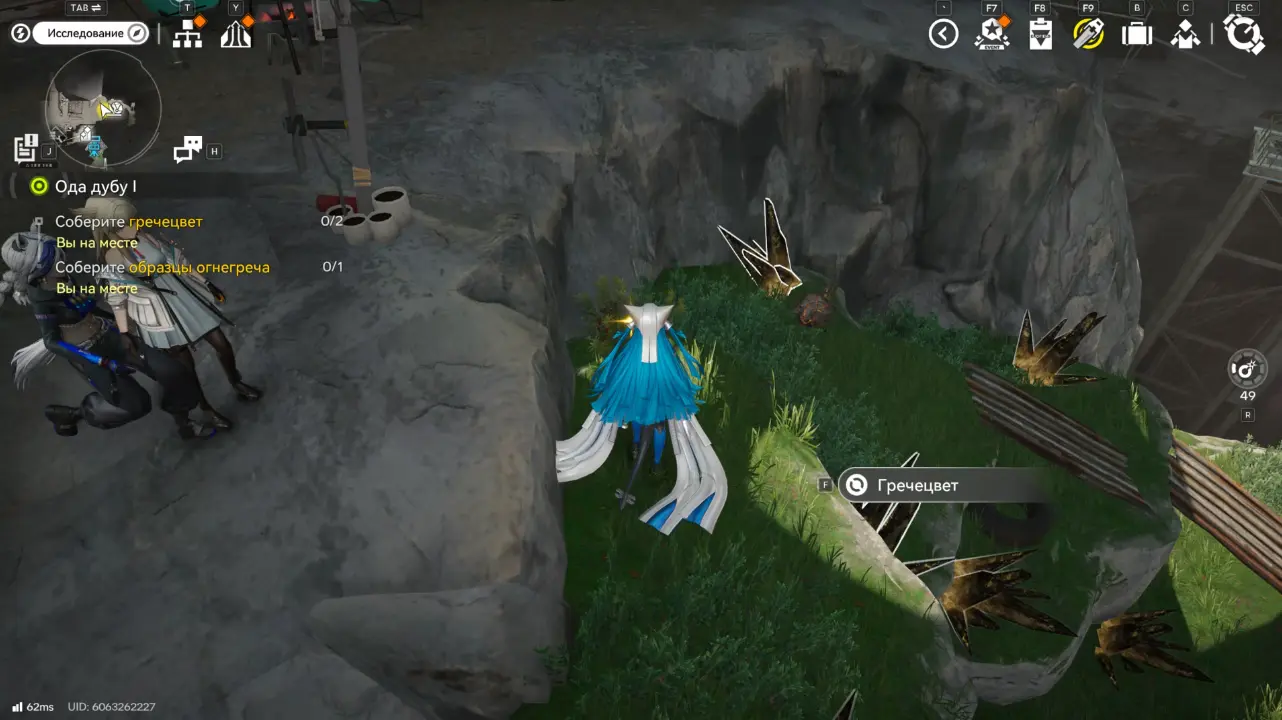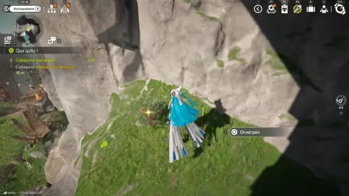 Первый Гречецвет находится справа, перед отмеченным выступом, он слегка подсвечен. Подойдите к нему и нажмите кнопку F для сбора.