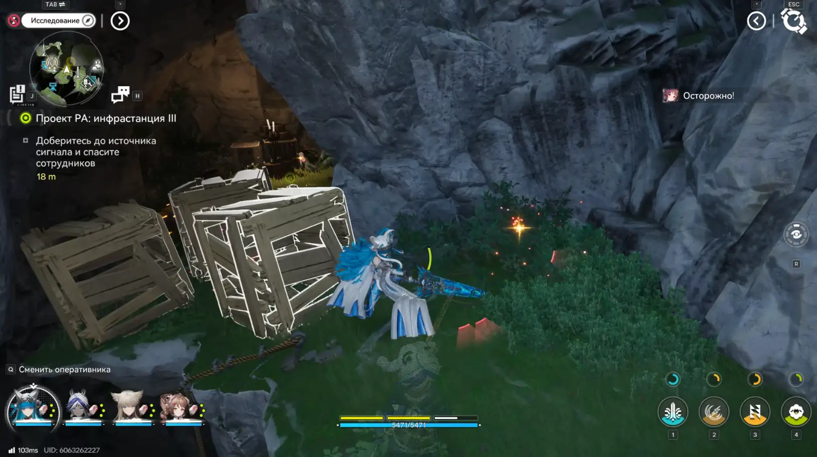 От точки ТП следуйте за маркером квеста вверх, пропавшие сотрудники укрываются в пещере неподалеку, перед которой стоят разрушаемые ящики. И будьте аккуратны, ведь сразу после телепортации позади вас есть расщелина в земле, в которую легко упасть.