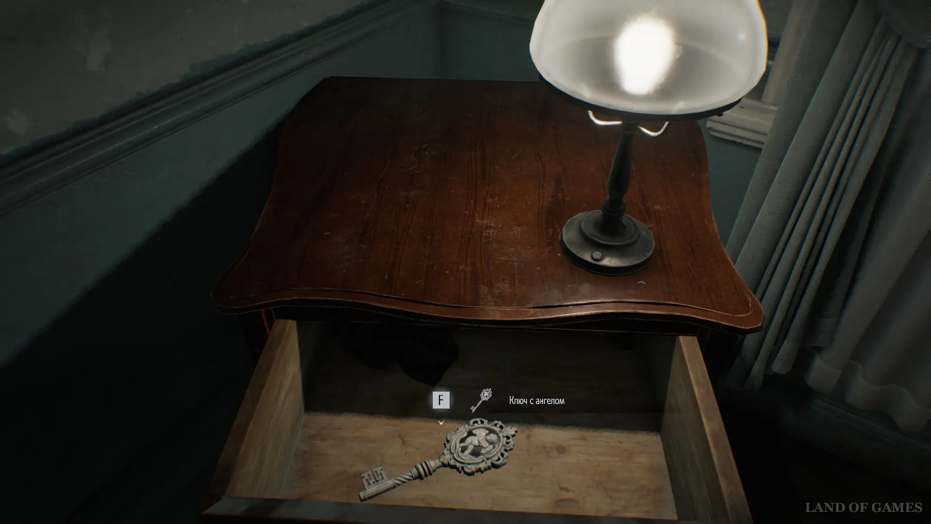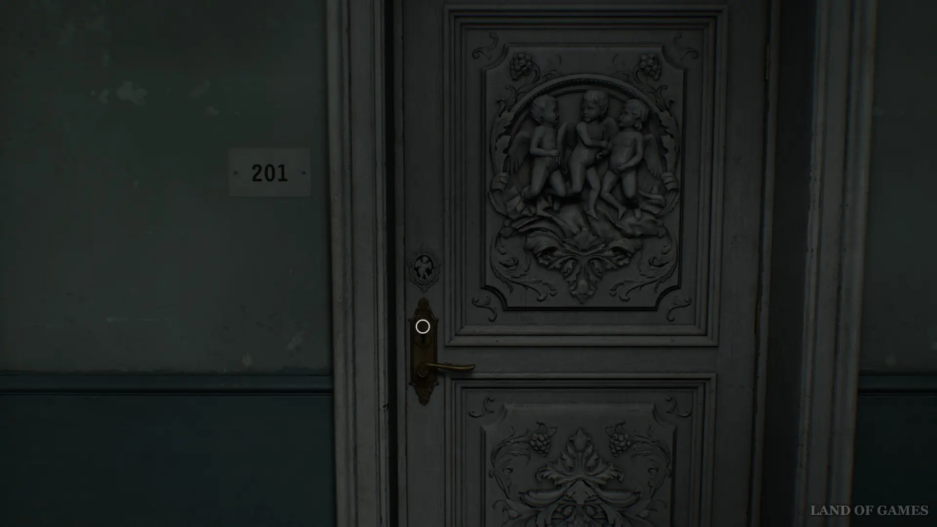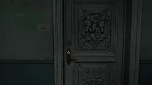 Следуйте до конца коридора и вытащите из комода Ключ с ангелом. Вернитесь к кабинету номер 201, мимо которого вы прошли ранее, и с помощью ключа откройте дверь.