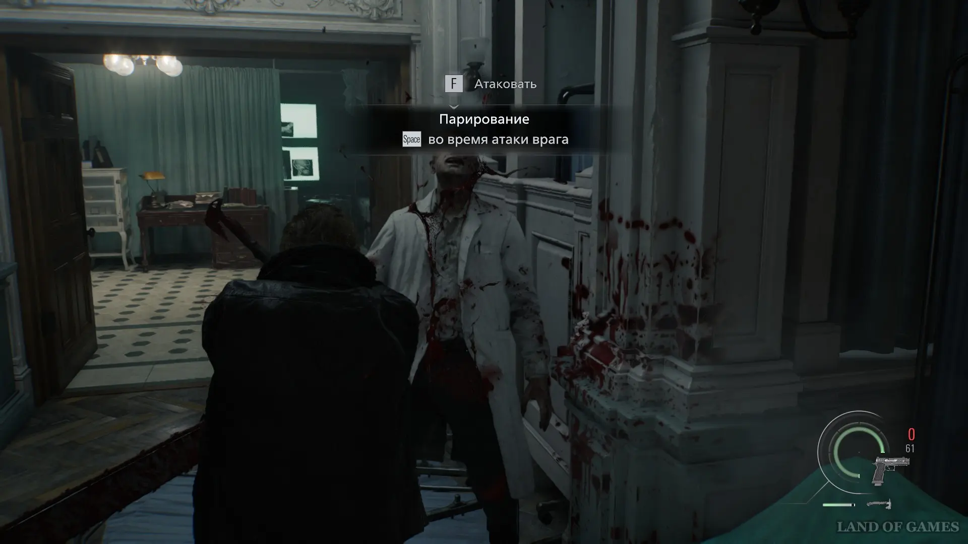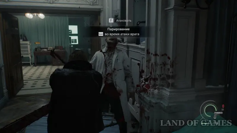 Первый враг будет атаковать вас бензопилой. Парируйте его атаки с помощью кнопки пробел и старайтесь держаться на расстоянии.