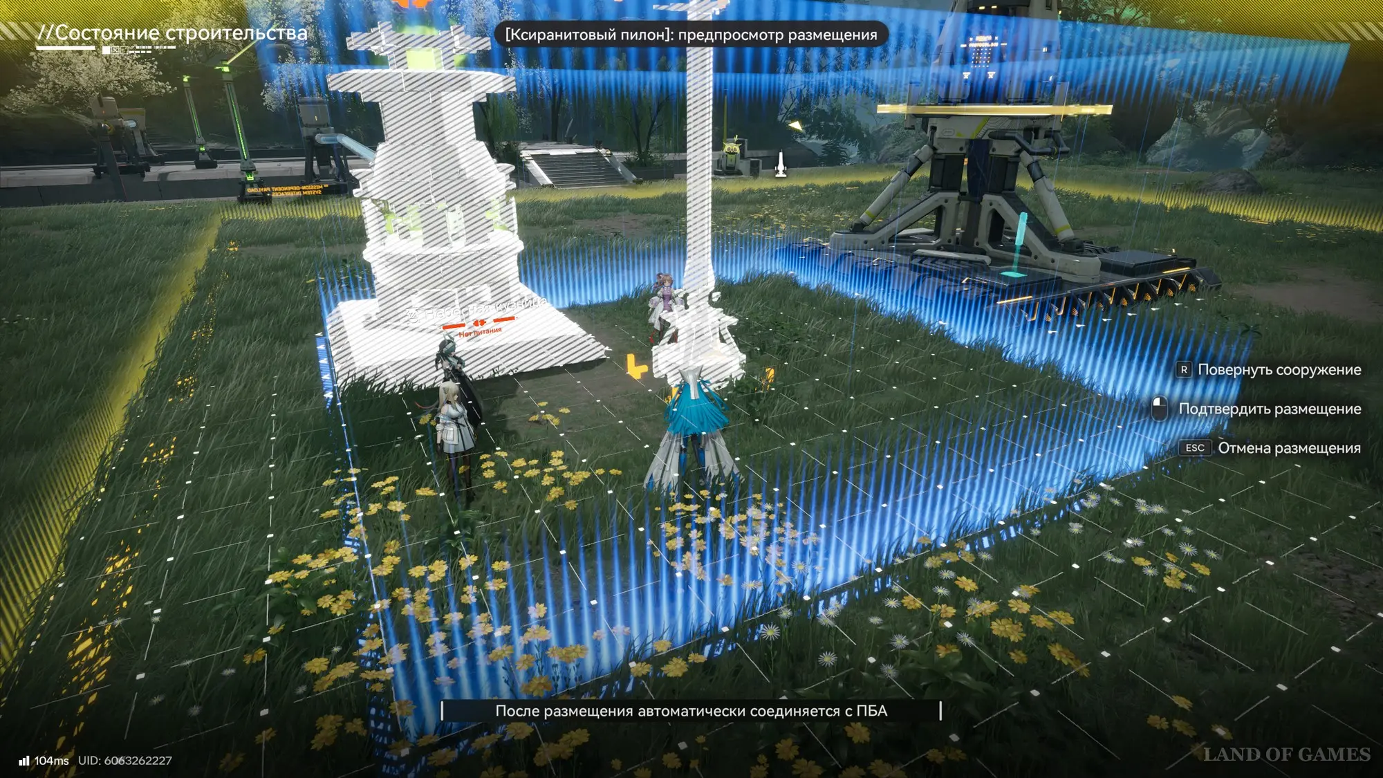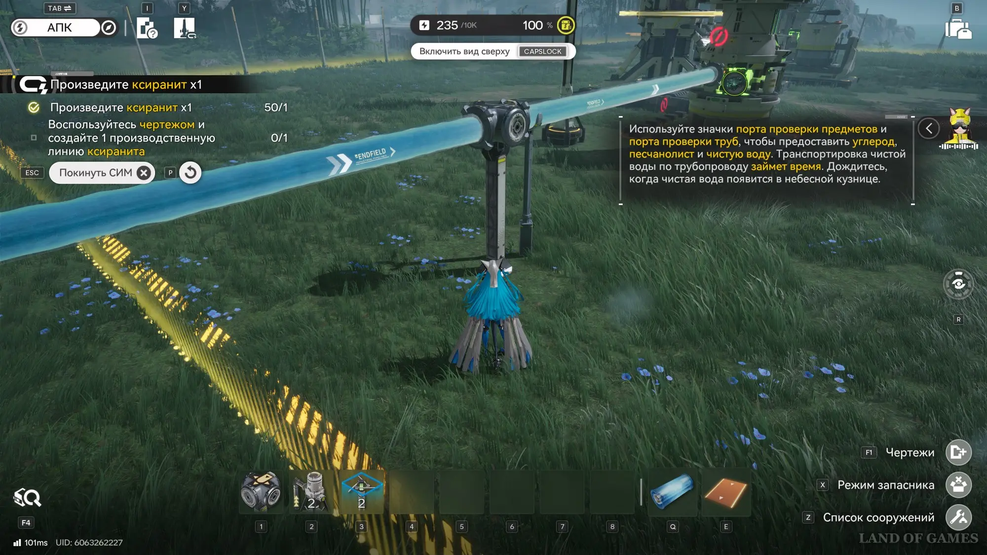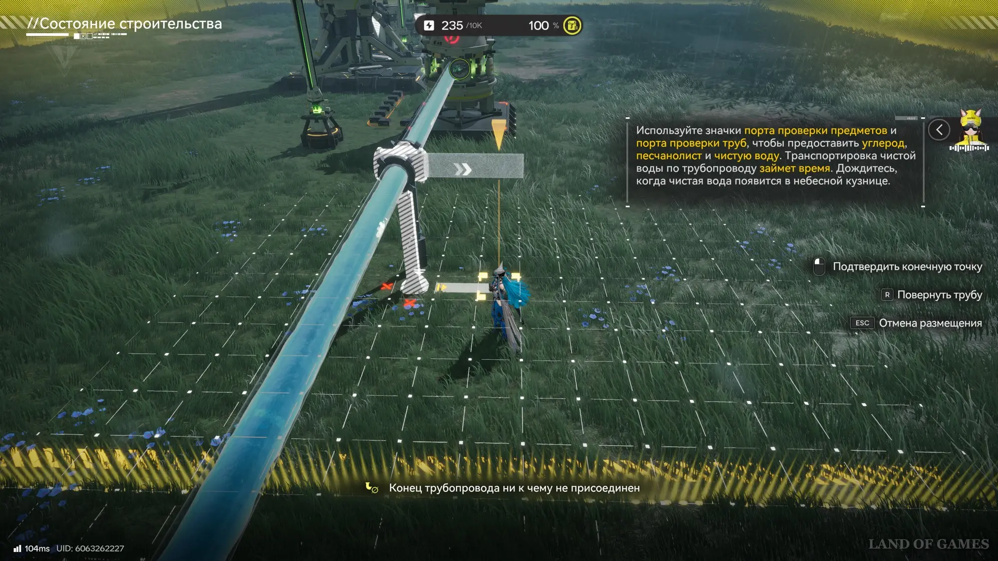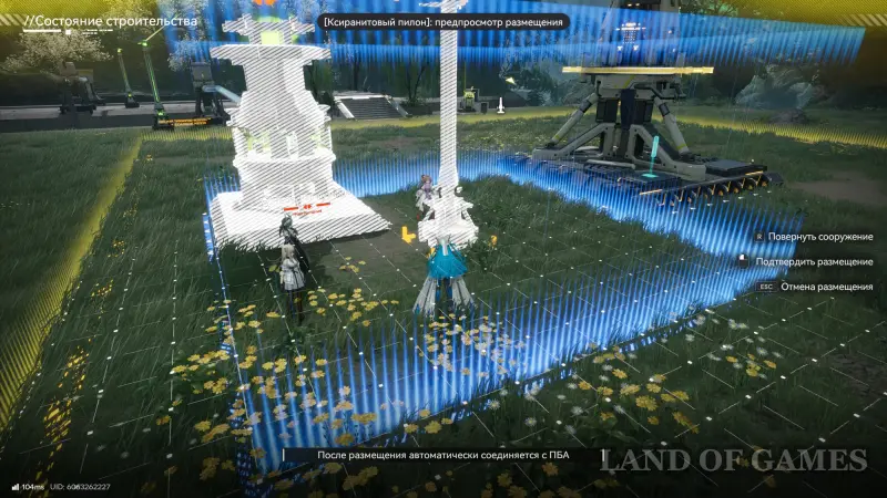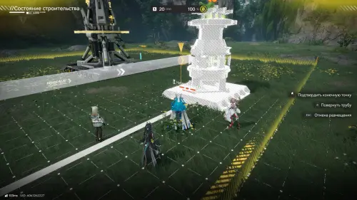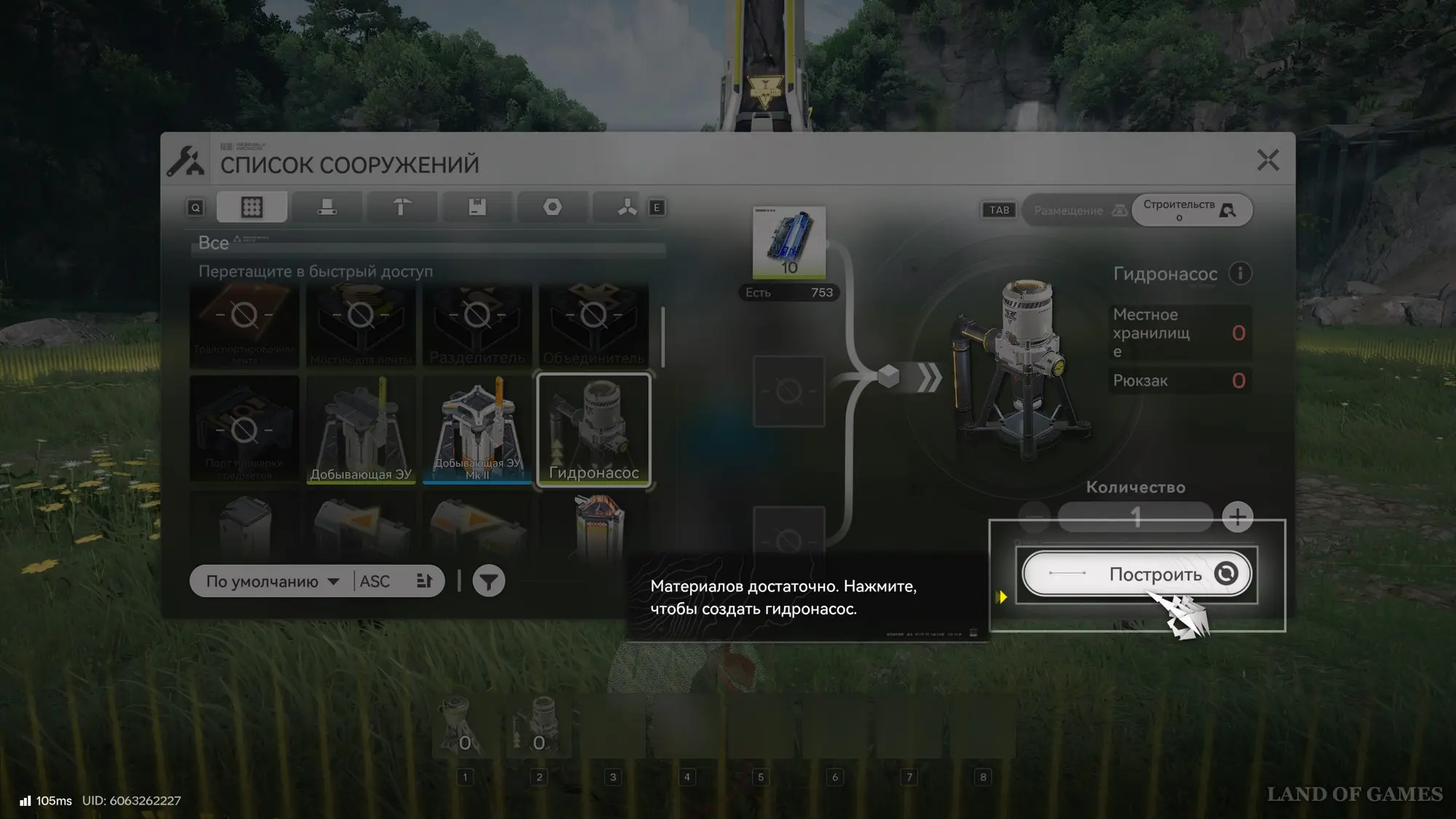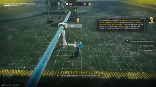 Пройдите немного на север, нажмите клавишу «Tab» для перехода в режим строительства и установите в отмеченных местах гидронасос и модуль подачи жидкости, а потом соедините их трубой. Затем выберите ксиронитовый пилон и поместите его рядом с ранее установленными устройствами, чтобы запитать их энергией.