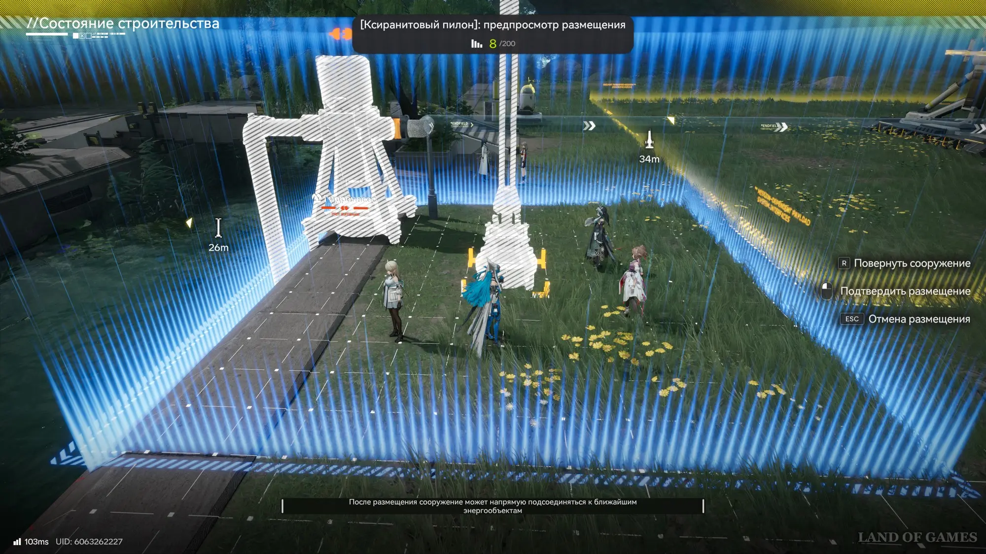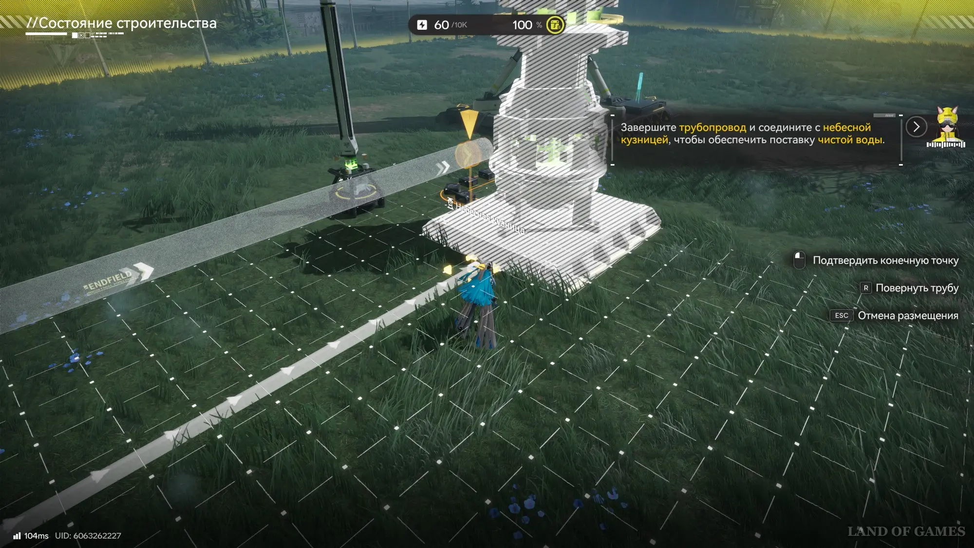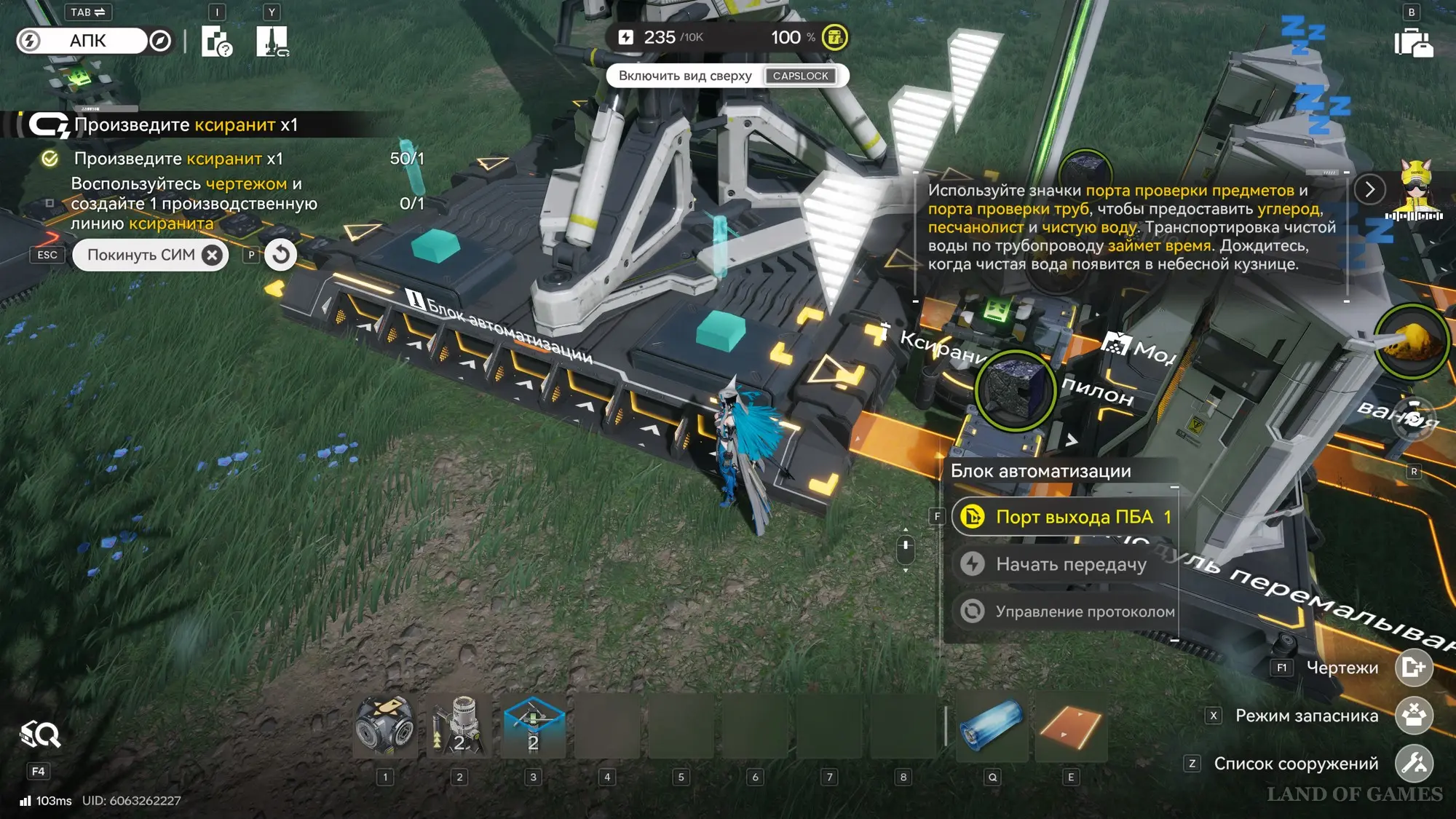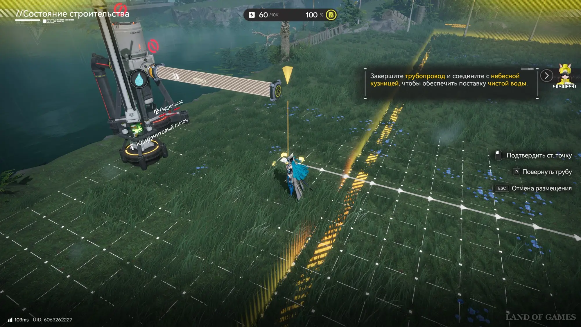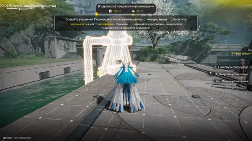 Пройдите немного на север, нажмите клавишу «Tab» для перехода в режим строительства и установите в отмеченных местах гидронасос и модуль подачи жидкости, а потом соедините их трубой. Затем выберите ксиронитовый пилон и поместите его рядом с ранее установленными устройствами, чтобы запитать их энергией.