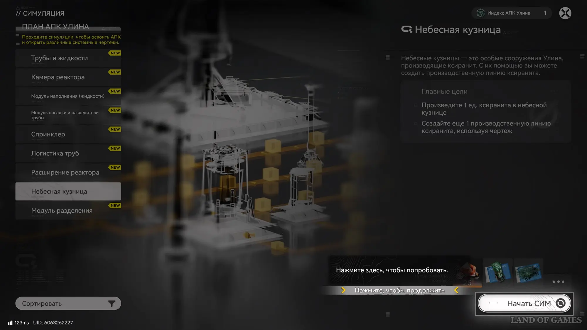 Телепортируйтесь к ключевой зоне АПК в Улине и встретьтесь здесь со своими друзьями. Затем откройте план АПК, перейдите в раздел симуляций и выберите СИМ, связанный с Небесной кузницей. После начала испытания подойдите к выделенному устройству и взаимодействуйте с ним для изучения производственной формулы ксиранита.