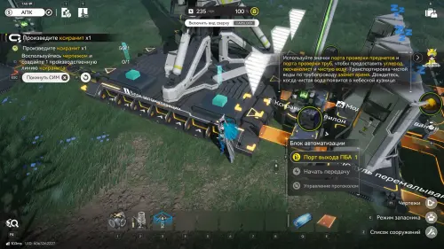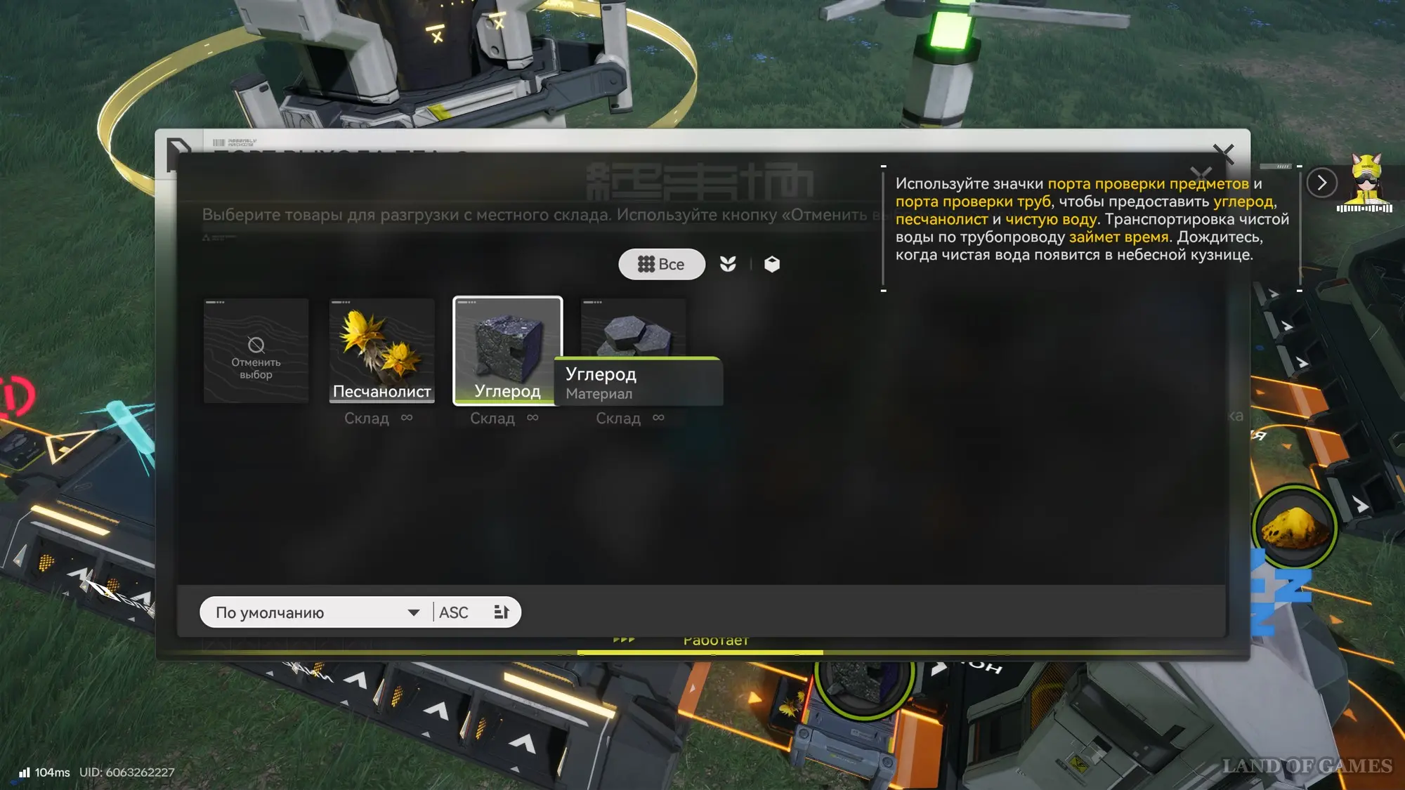 Для запуска производства сначала подойдите к портам АПК и выберите необходимые ресурсы для поставки на конвейер: песчанолист и углерод.