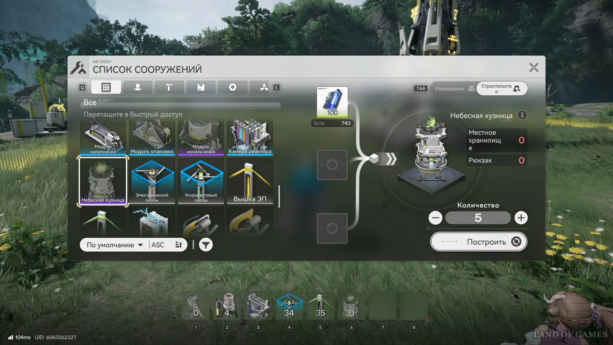 Откройте список сооружений (Z), выберите небесную кузницу и постройте несколько штук, потратив ферриевые детали (если у вас их нет, то можете найти чертежи по их производству в нашем отдельном гайде). Далее разместите небесную кузницу возле АПК, как показано на скриншоте ниже (убедитесь, что она размещена правильной стороной, то есть порты входов смотрят в сторону базы).