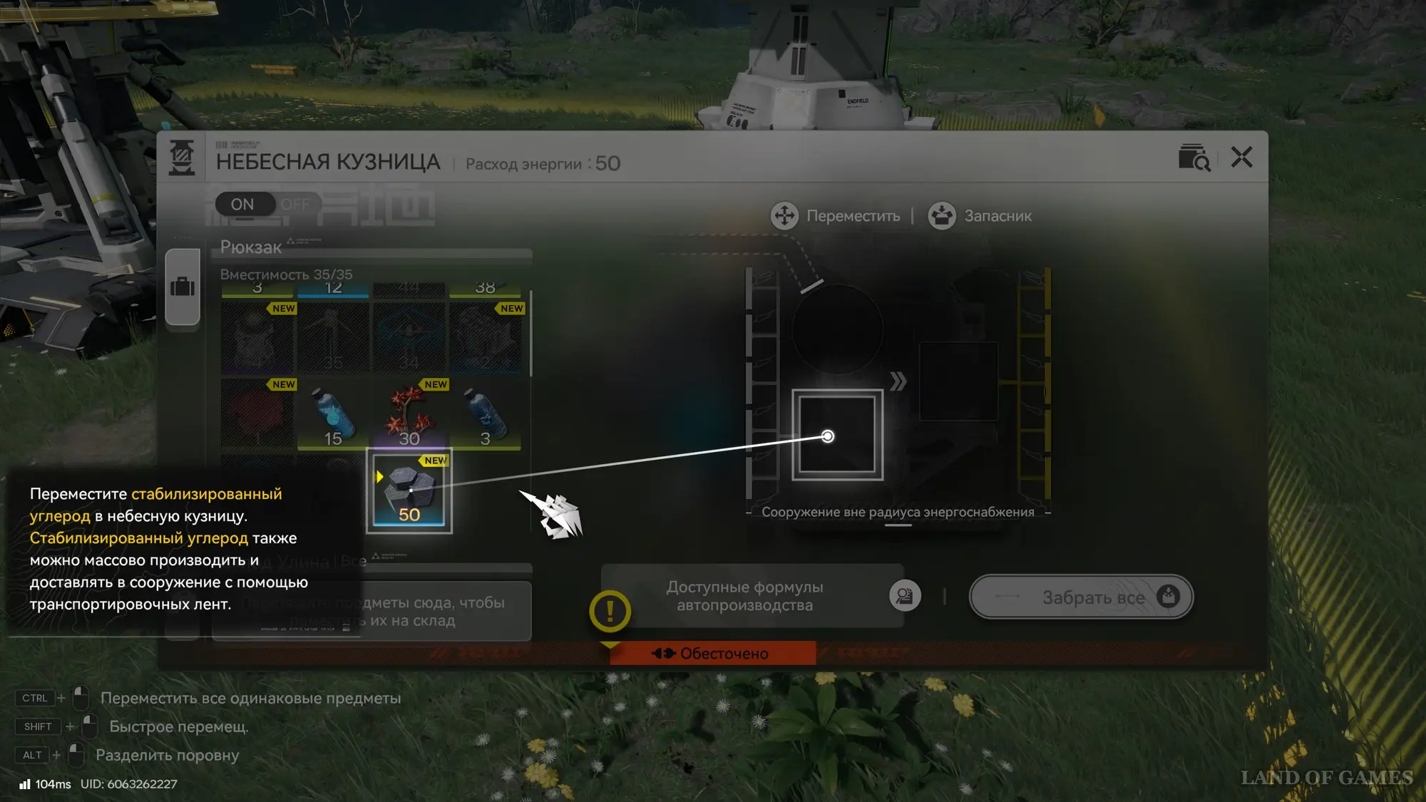 Затем взаимодействуйте с небесной кузницей и следуйте инструкции, поместив в устройство стабилизированный углерод (он уже будет у вас на складе). Далее подойдите к реке, разместите там гидронасос и соедините его трубой с небесной кузницей. Не забудьте также установить ксиранитовые пилоны рядом с гидронасосом и небесной кузницей, чтобы запитать их.