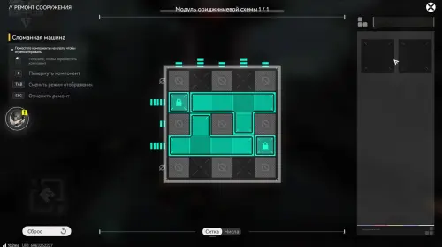 Разобравшись с мини-боссом, поднимитесь наверх и взаимодействуйте с главным сооружением центра наблюдений, чтобы взяться за его ремонт. Вам предстоит решить небольшую головоломку с ориджиниевой схемой. Правильное решение продемонстрировано на скриншоте ниже.