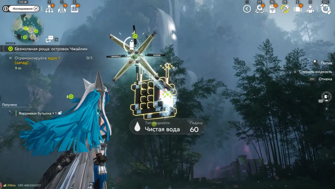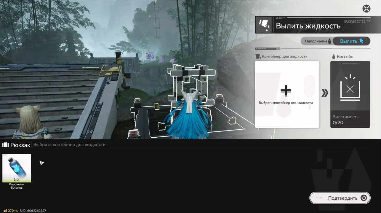 Выберите Ферриевую бутылку и нажмите «Подтвердить», а затем «Вылить». После заполнения механизма мост активируется, и вы сможете пройти дальше.