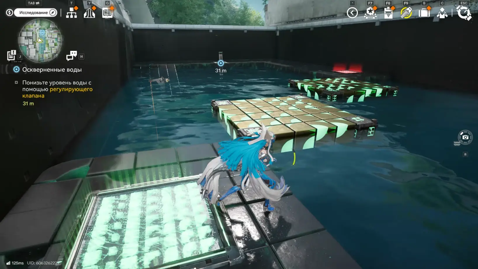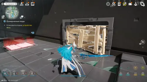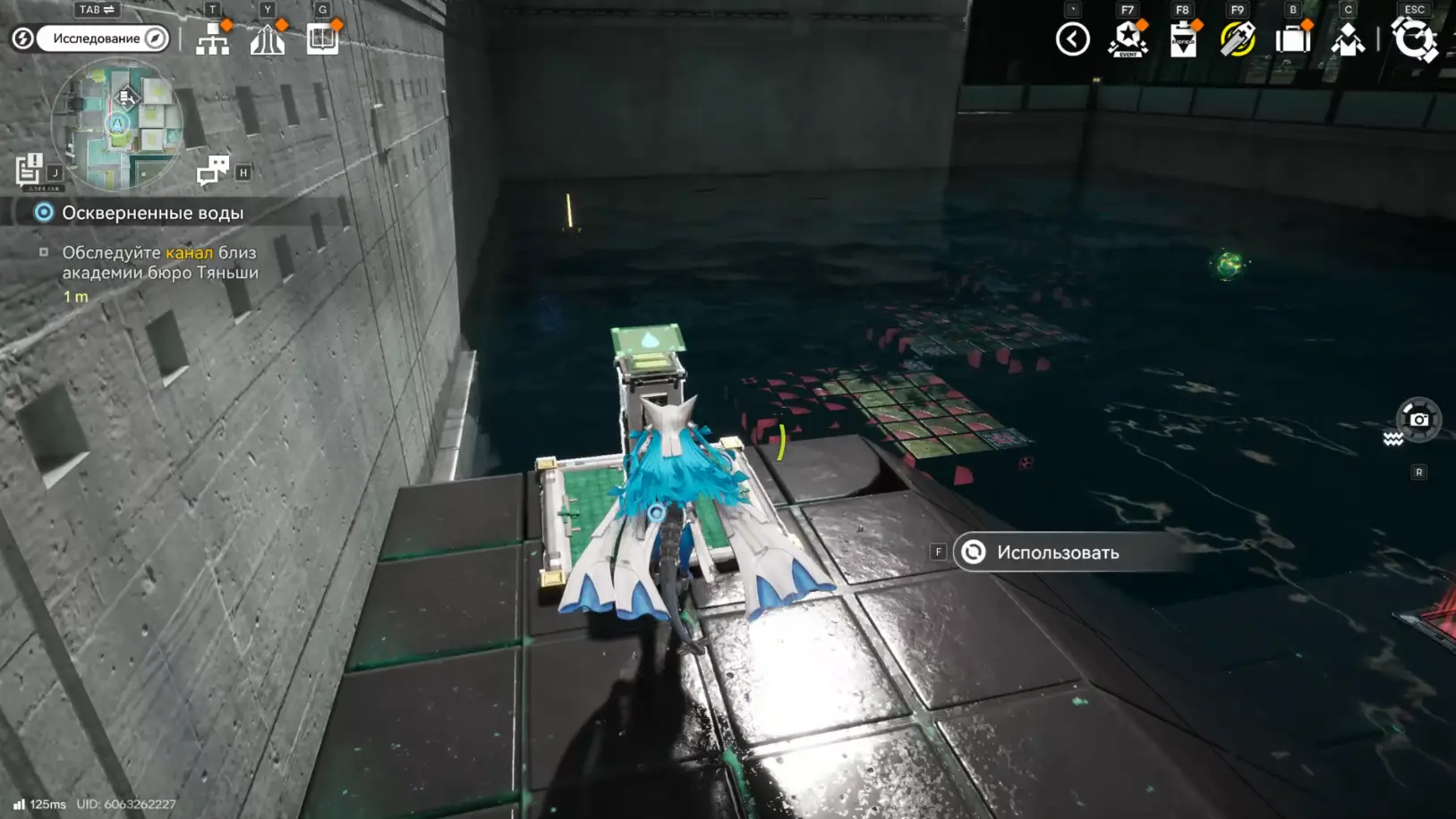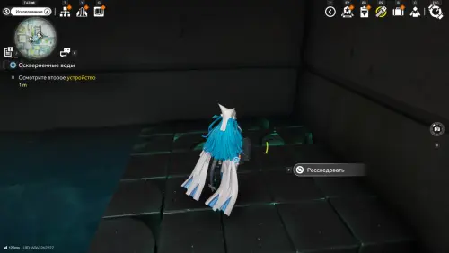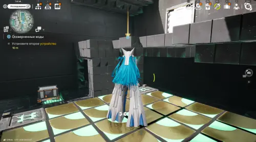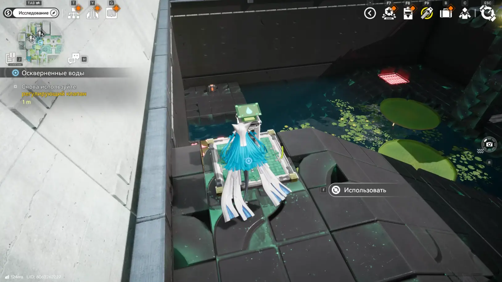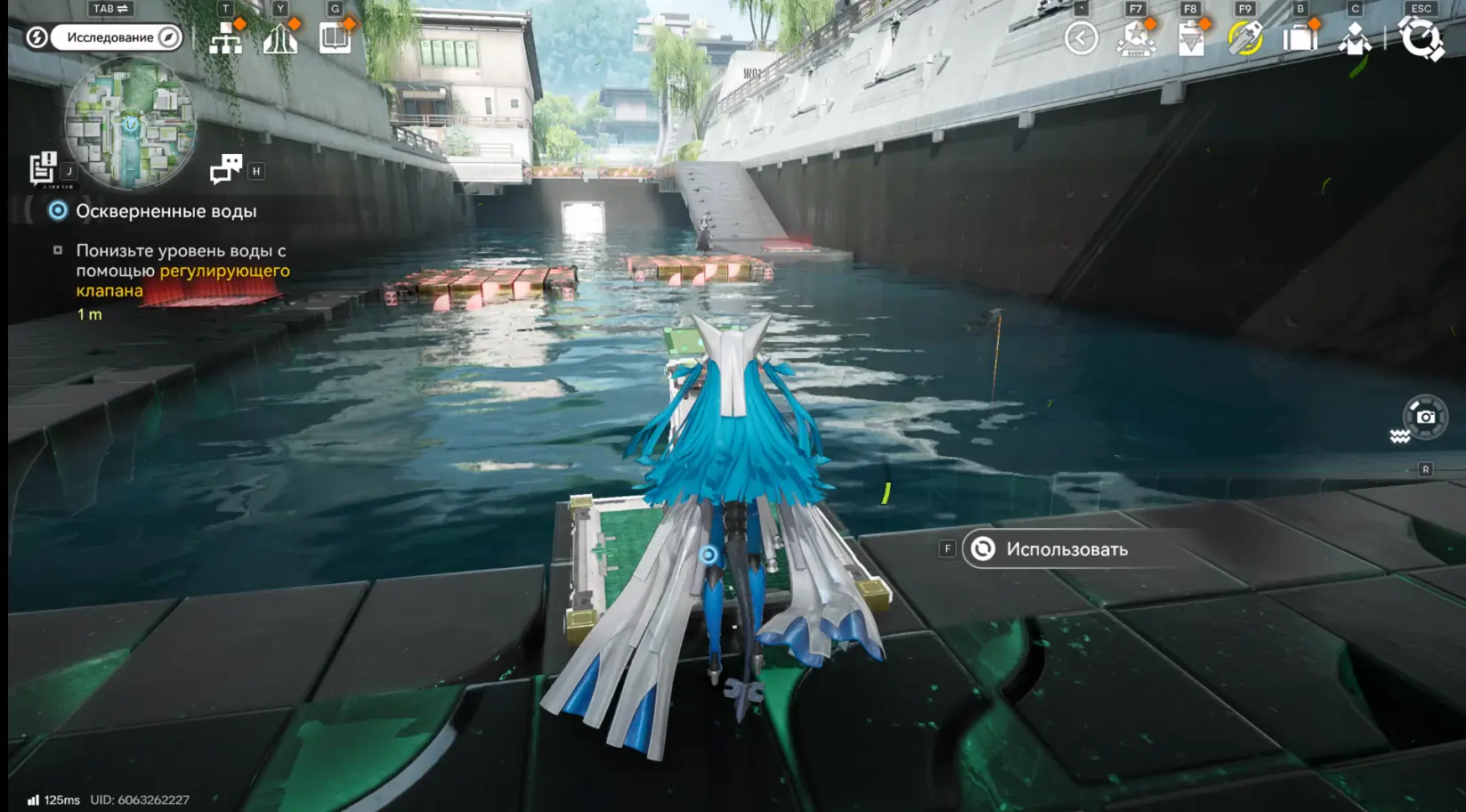 Чтобы продолжить исследование, используйте ближайший регулирующий клапан уровня воды. Взаимодействуйте с ним, чтобы снизить уровень воды в канале. Когда вода отступит, станет видно платформу со странным устройством. Теперь можно спуститься вниз по наклонной дорожке и приблизиться к объекту.