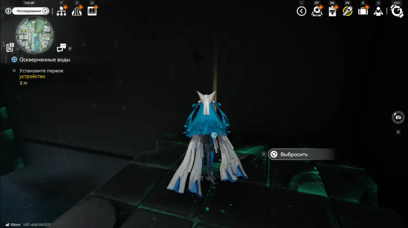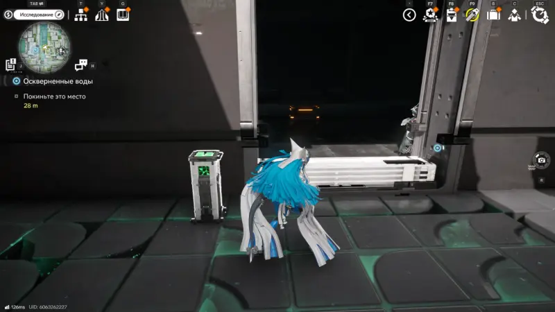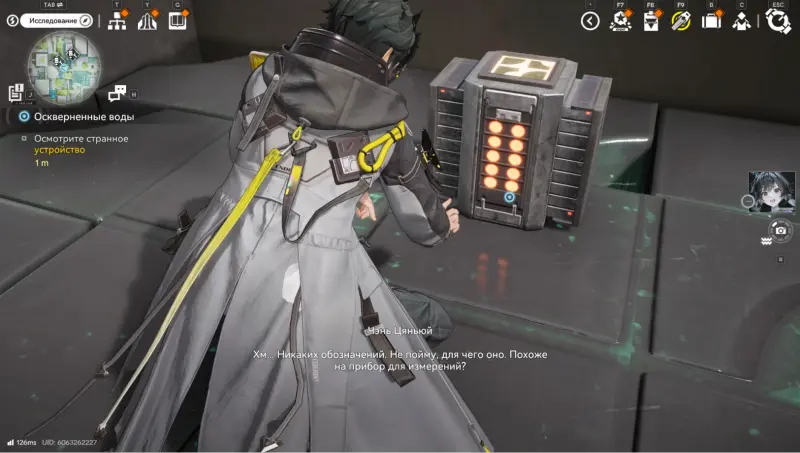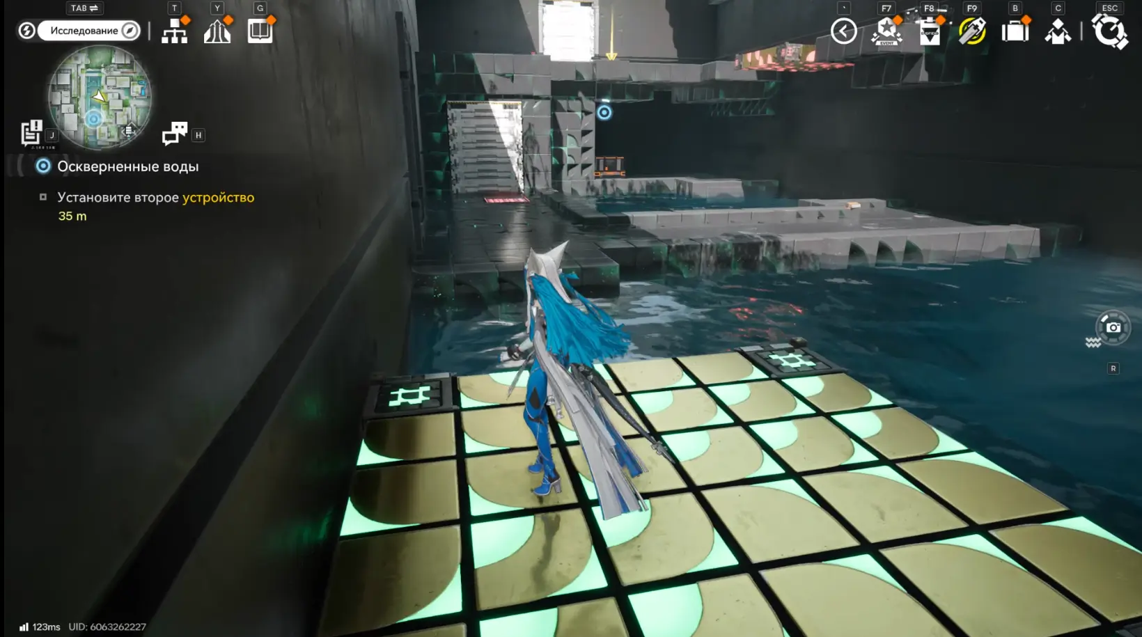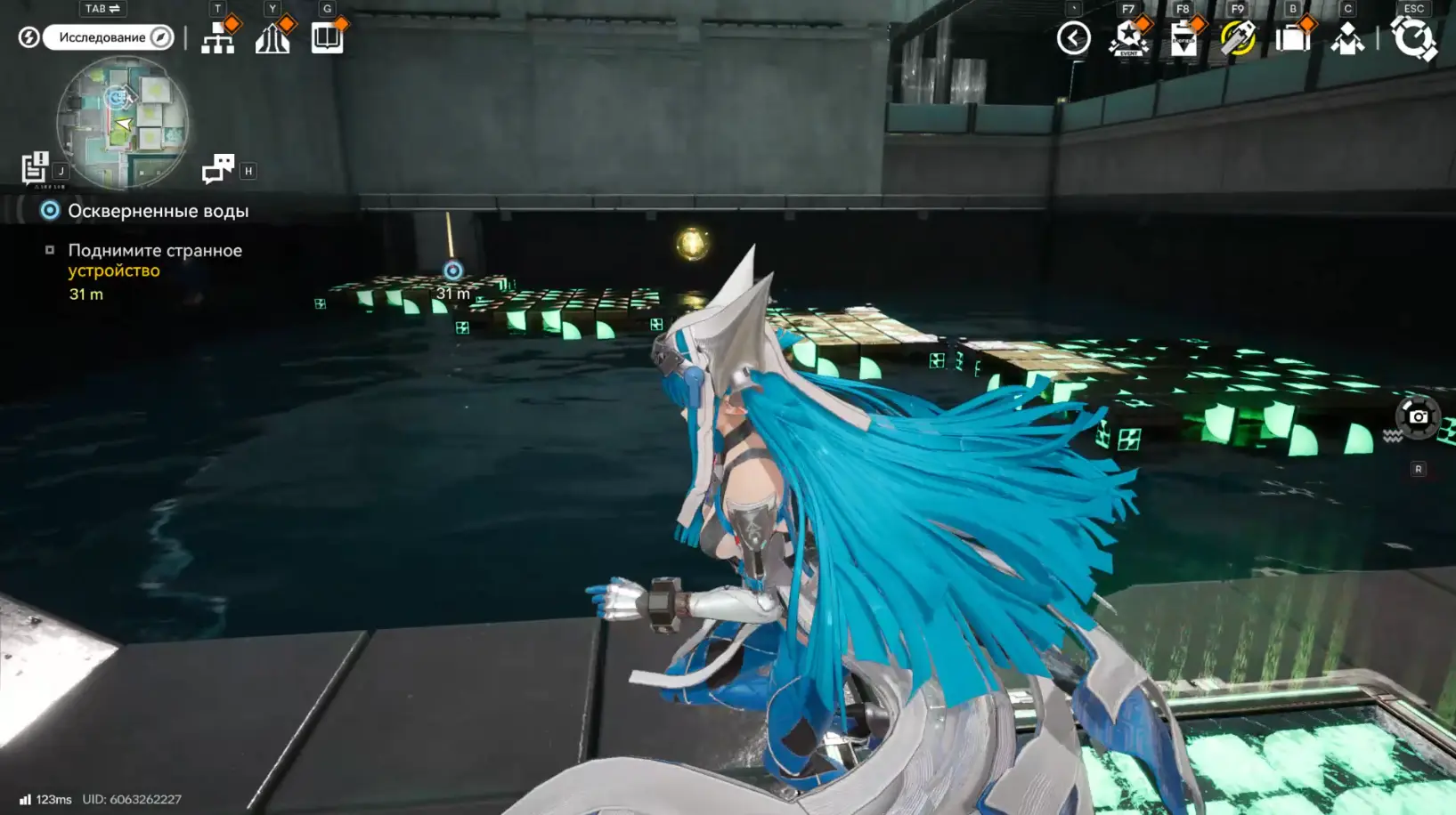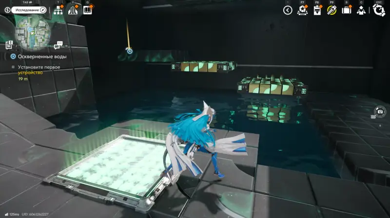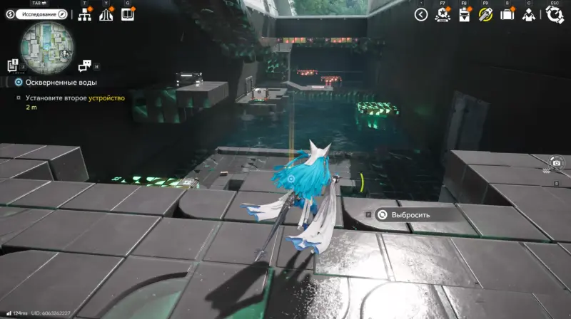 Чтобы продолжить исследование, используйте ближайший регулирующий клапан уровня воды. Взаимодействуйте с ним, чтобы снизить уровень воды в канале. Когда вода отступит, станет видно платформу со странным устройством. Теперь можно спуститься вниз по наклонной дорожке и приблизиться к объекту.
