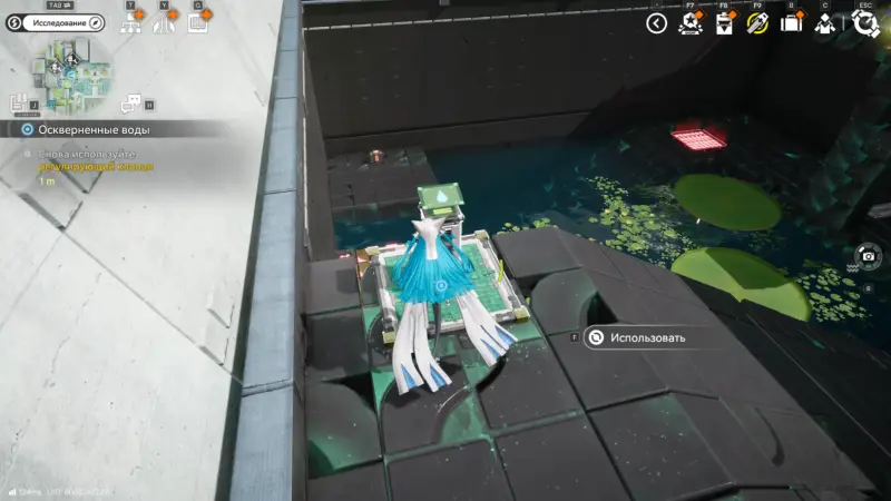 На пути к устройству есть небольшая головоломка. Вам нужно использовать листья лотоса и платформы. Сначала запрыгните на листок и доберитесь до светящегося красного квадрата в правой части, это переключатель, который передвинет платформу на противоположной стороне ближе к устройству. После этого снова перемещайтесь по лотосам, пока не доберетесь до нужного места.