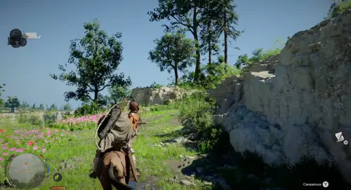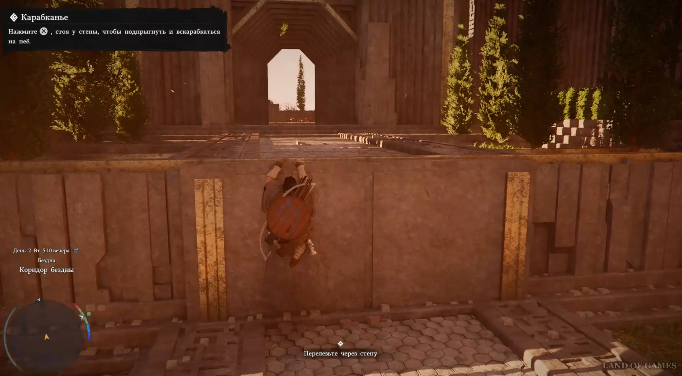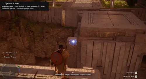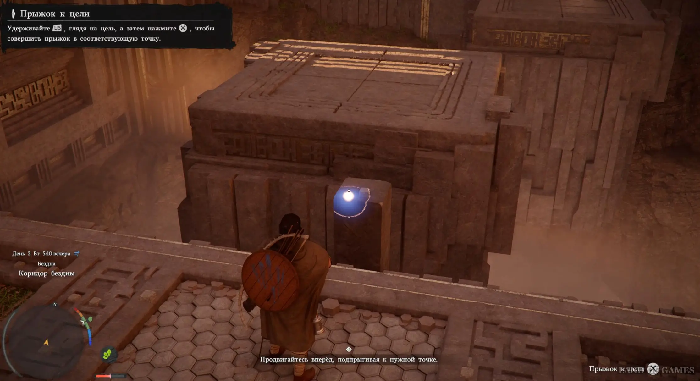 Пройдите еще дальше. Далее выполните прыжок к цели – для этого нужно зажать LB, прицелиться к столбу, и только потом нажать на «Х». Преодолейте расщелину таким образом. Затем подойдите к выступу и заберитесь на него, снова совершив прыжок.