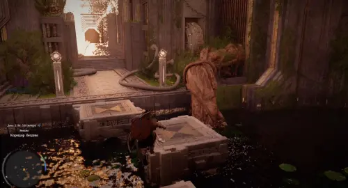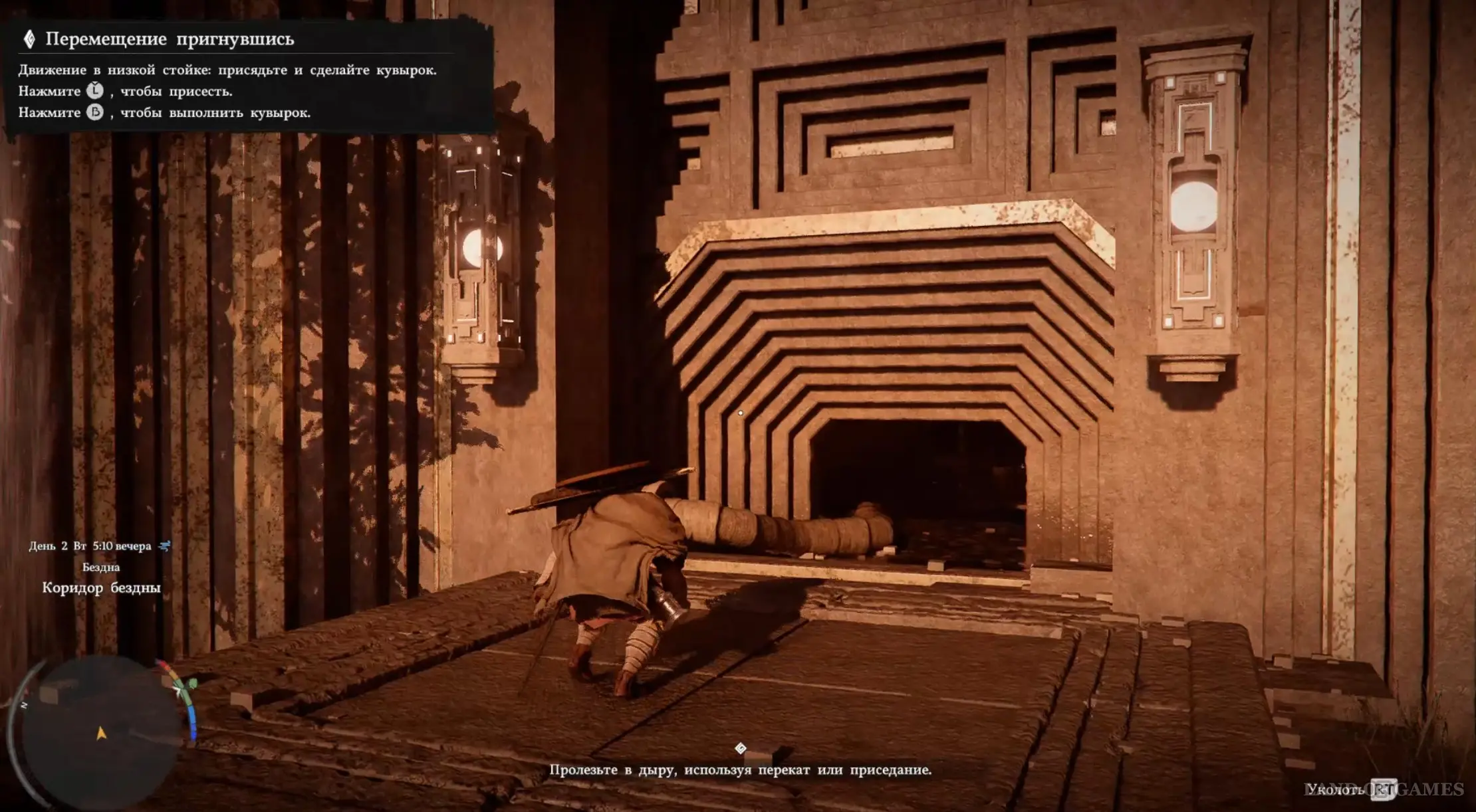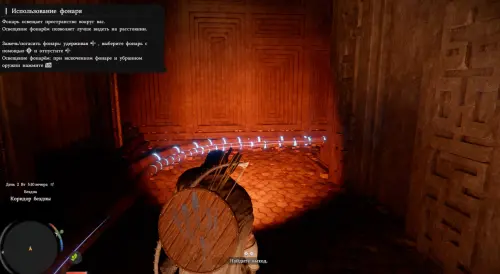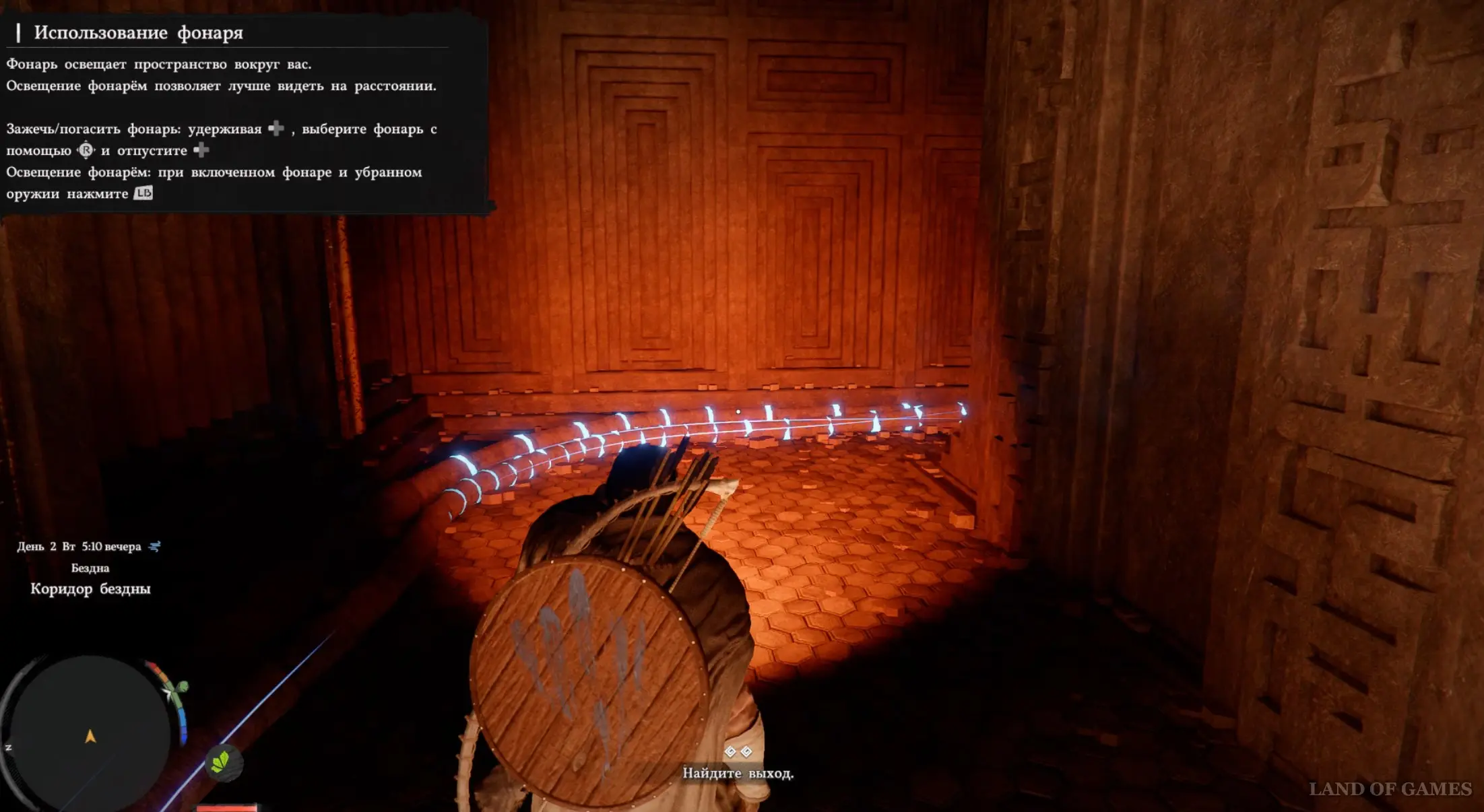 Пройдите дальше и перепрыгните на другую сторону через воду, используя движущиеся платформы. Войдите в туннель и возьмите в руки фонарь (LB), чтобы осветить пространство. Идите по коридору вперед, и вскоре вы выберетесь на поверхность. Продолжайте бежать дальше.
