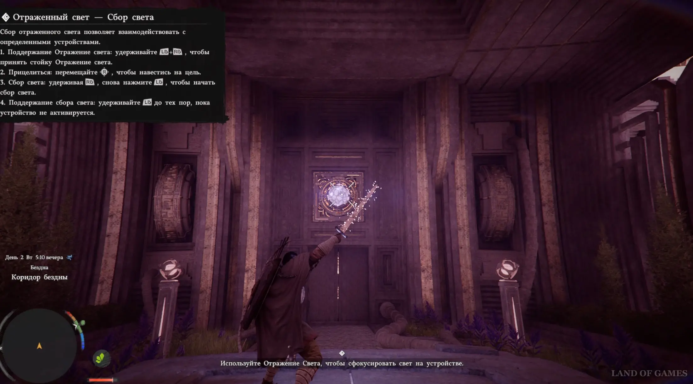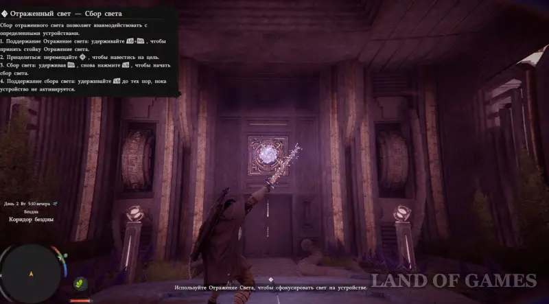 Удерживая зажатой RB, наведите прицел на желтый кристалл, установленный над запертой дверью, и снова нажмите LB для сбора света. Дождитесь, пока сфера не станет синей, в результате чего проход откроется.